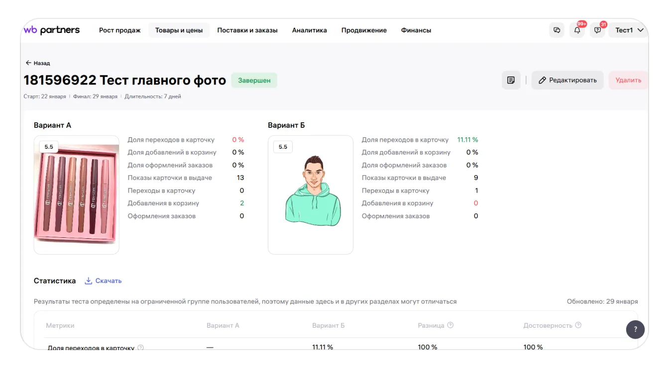 В ходе теста примерно половина покупателей увидит вашу карточку с одним главным фото, а вторая половина — с другим. Затем Wildberries сравнит результаты. После теста вы сможете поставить в карточку более удачное фото.