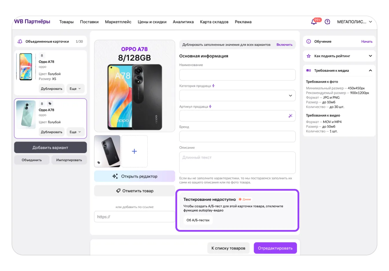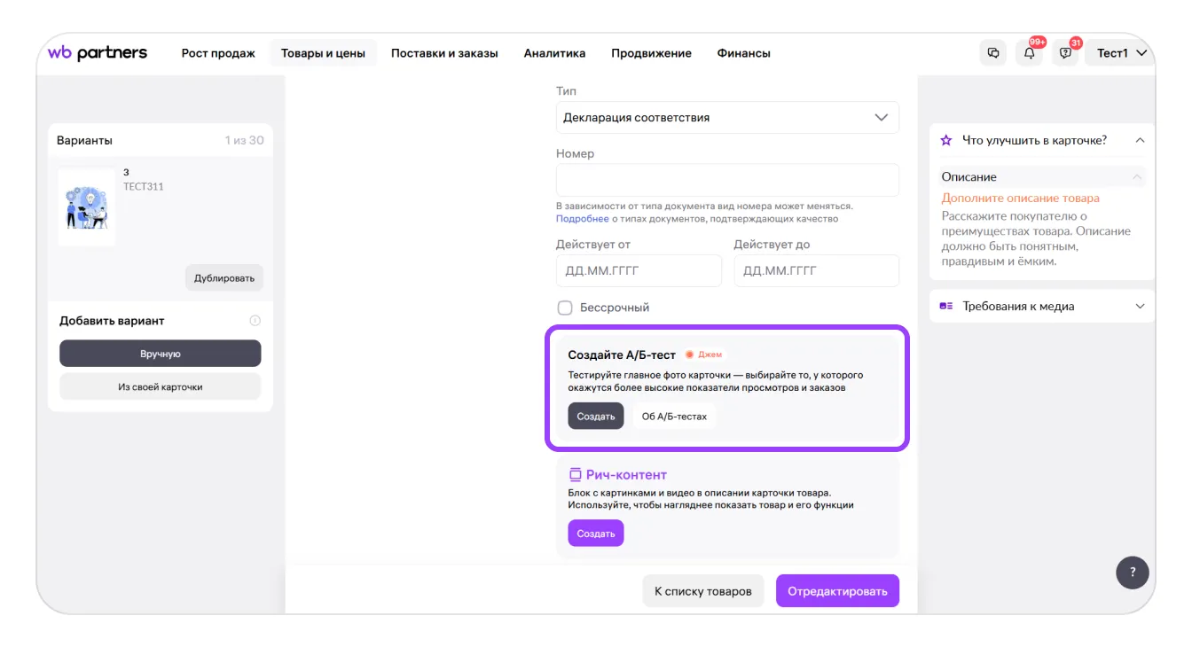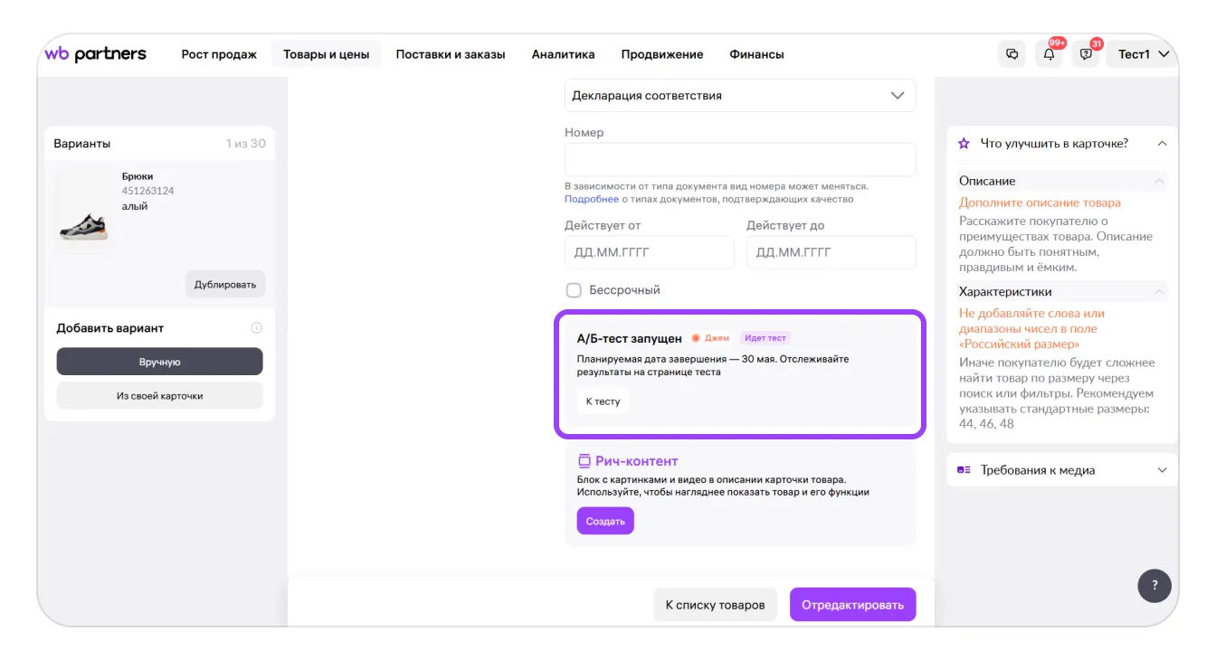 Если вы замените главное фото в карточке, система автоматически предложит запустить А/Б-тест через сервис «А/Б-тестирование главного фото в карточке товара». Сможете проверить, какое фото принесёт больше просмотров и заказов — новое или предыдущее.