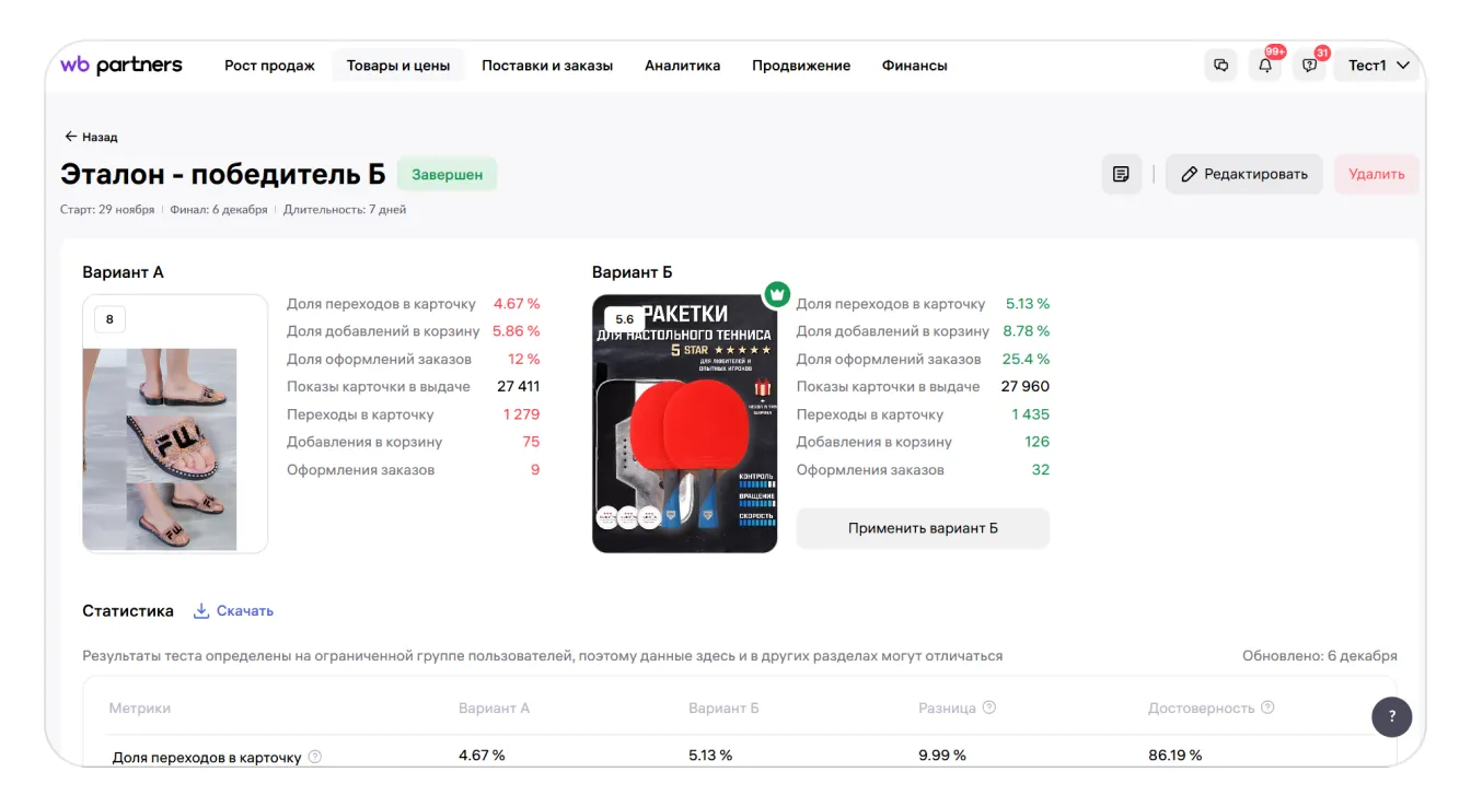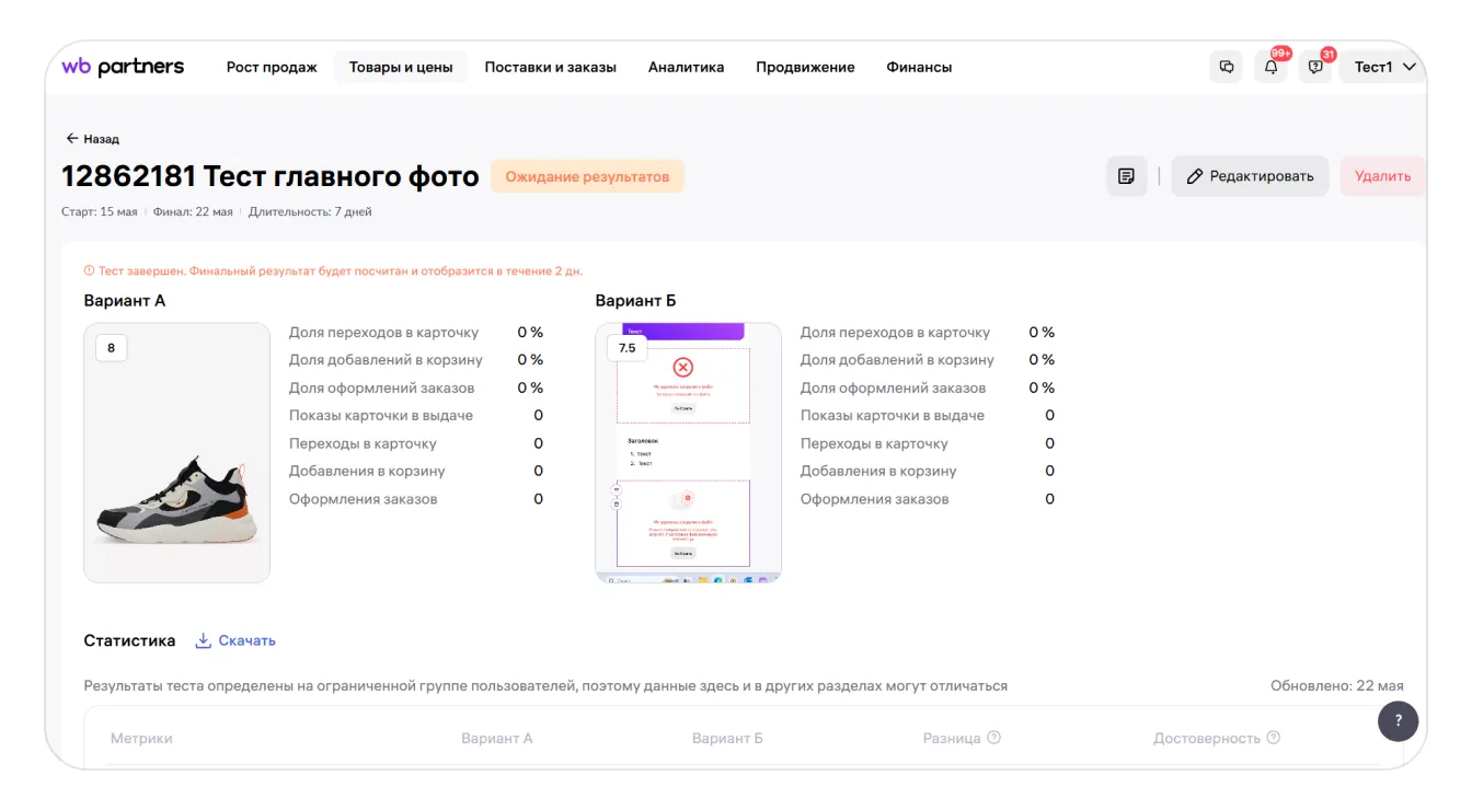 Если хотите провести ещё один тест, убедитесь, что фотографии, которые вы выбрали, явно отличаются друг от друга и соответствуют характеристикам, которые описаны в начале инструкции. Можно попробовать провести тест с большей длительностью или запустить продвижение карточки. Эти меры должны помочь получить статистически значимый результат.