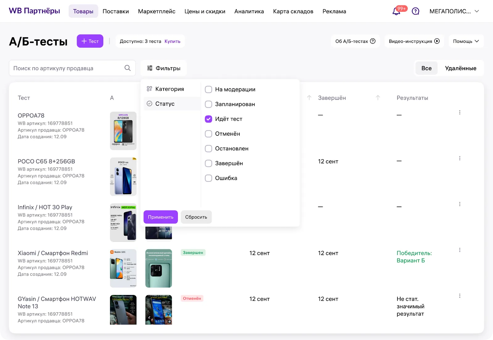 Можно использовать поиск по артикулу продавца или отфильтровать тесты по категории из карточки товара и статусу.