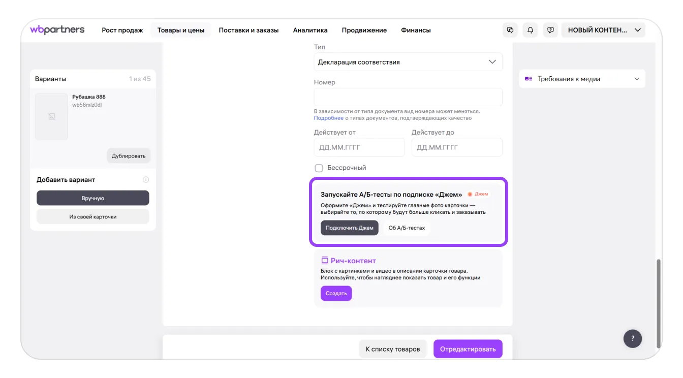 Если у вас нет подписки «Джем», вместо возможности запустить А/Б-тест из карточки, у вас появится предложение подключить подписку.