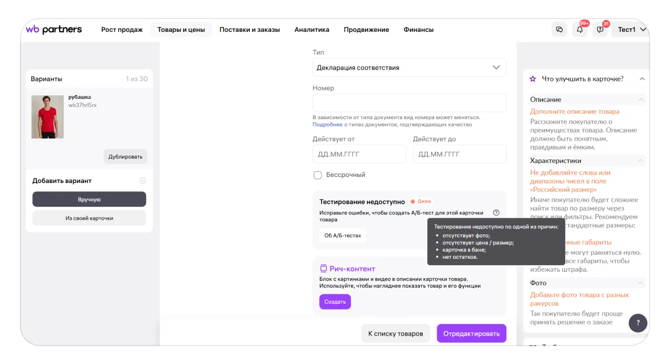 Wildberries отменяет тест после его создания, если возникла одна из проблем: