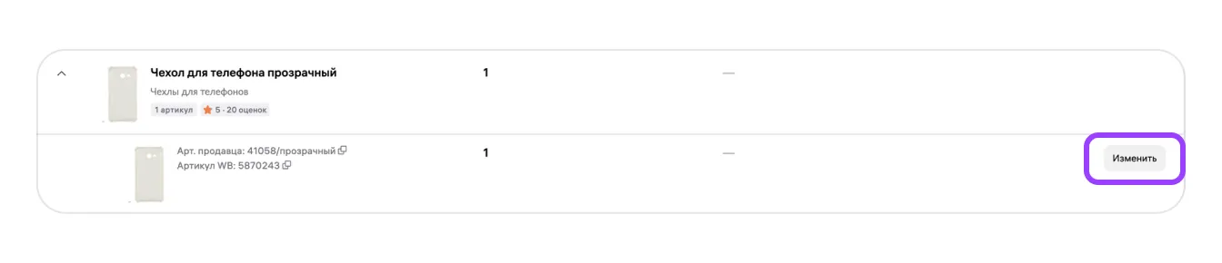 Шаг 2. Выбрав нужный товар и артикул, нажмите «Изменить».