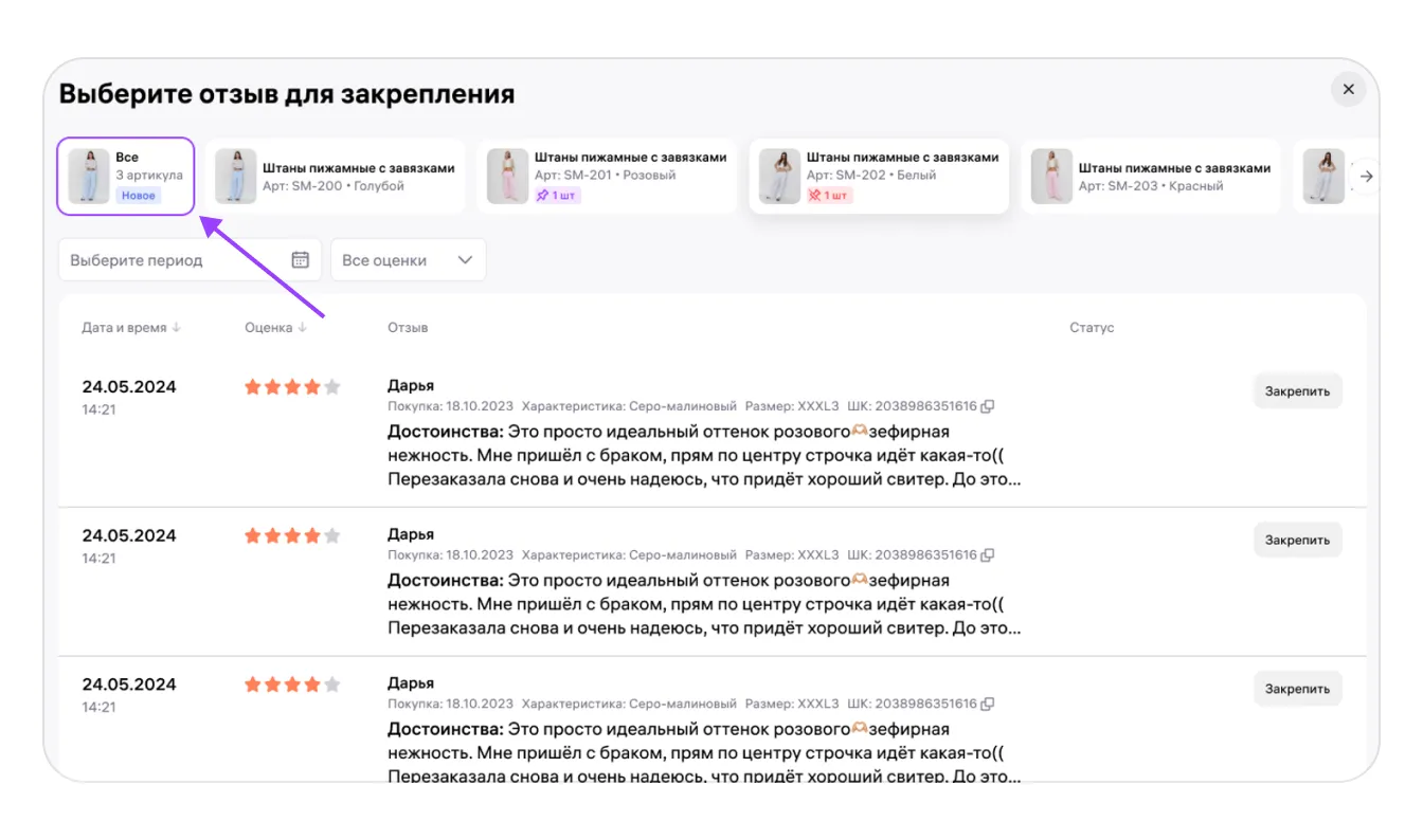 В общем списке карточек кликните на нужную. Вверху открывшейся страницы вы увидите все варианты товара, объединённые в этой карточке. В списке вариантов выберите «Все», а затем нажмите «Закрепить» напротив нужного отзыва. Отзыв станет закреплённым для всей склейки, но на странице отдельных вариантов товара он не будет отображаться как закреплённый.