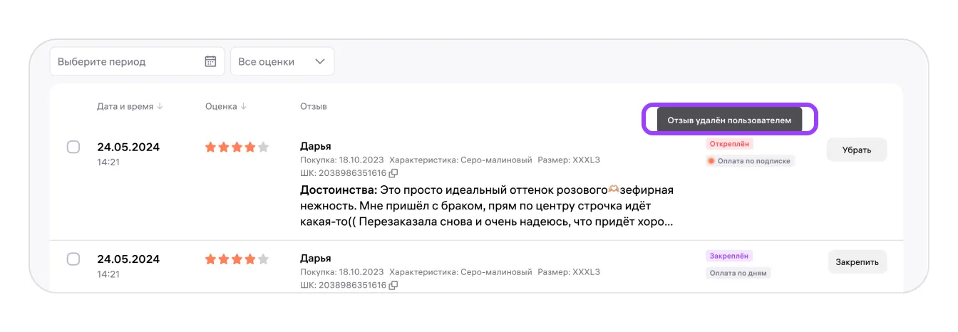 В рамках одного оплаченного периода — в зависимости от варианта оплаты — вы можете открепить отзыв и закрепить другой без доплаты. Это позволит гибко управлять отображением отзывов в зависимости от ваших потребностей.