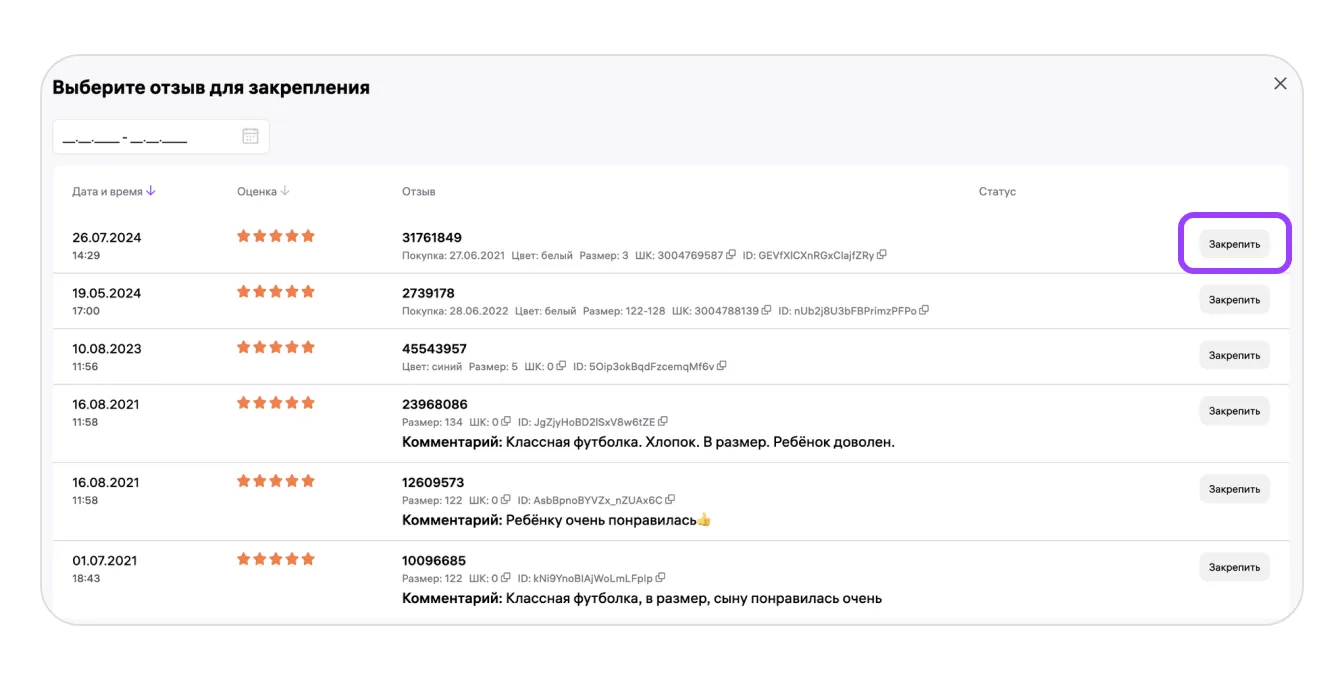 Шаг 4. Найдите в списке нужный отзыв и нажмите «Закрепить».