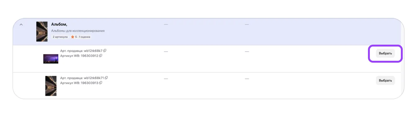 Шаг 3. Нажмите на товар в списке. Если у товара несколько вариантов, выберите нужный артикул и нажмите «Выбрать».