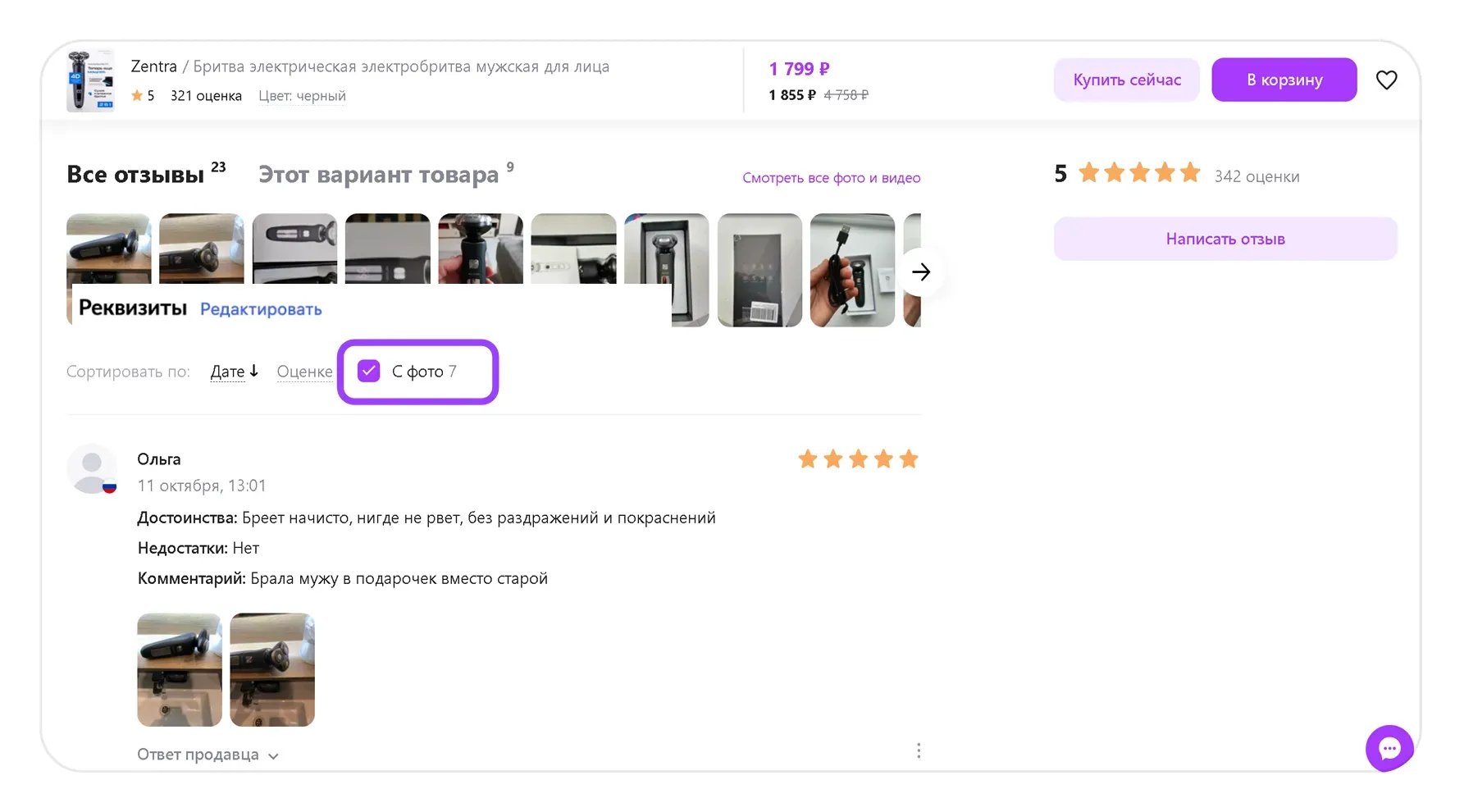 Покупатели часто используют этот фильтр, поэтому рекомендуем закреплять именно отзывы с фото или видео.