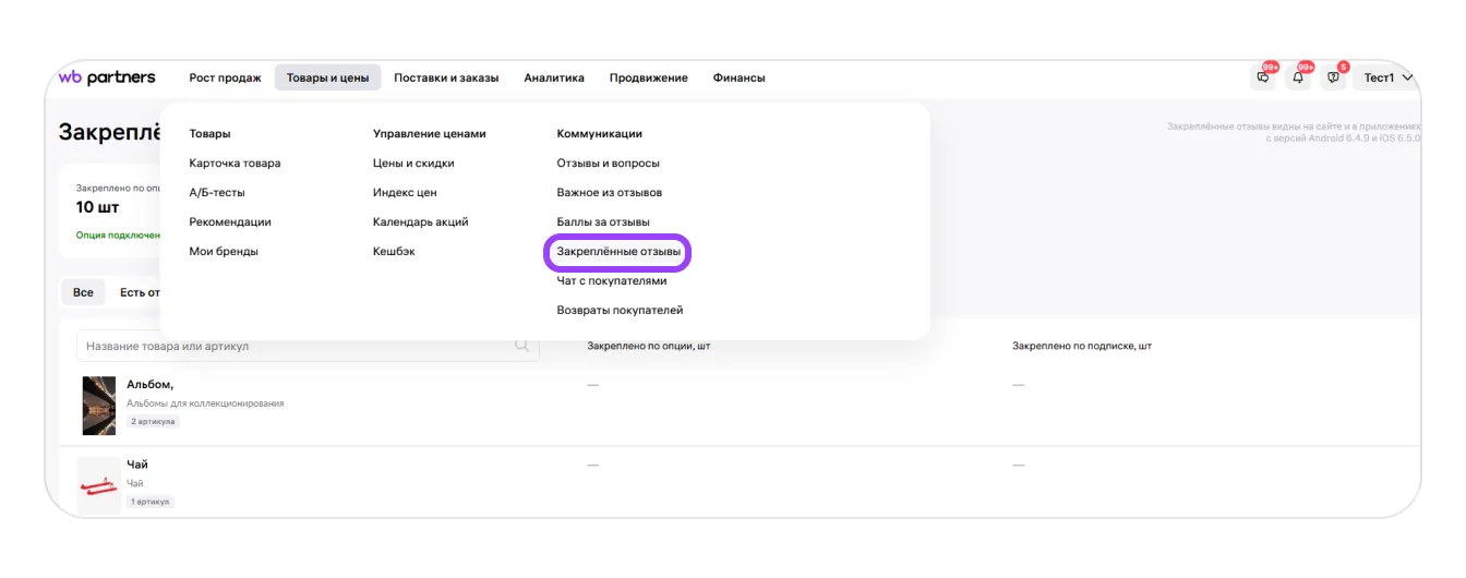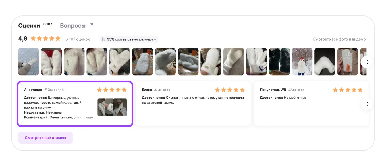 Отзывы в карточке товара можно закрепить. Закреплённые отзывы всегда будут наверху, и покупатели увидят их первыми. Это позволит вам подсветить преимущества своих товаров и вас как продавца — например, высокое качество товара и сервиса, справедливую цену или быструю доставку.