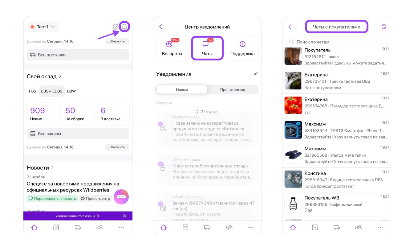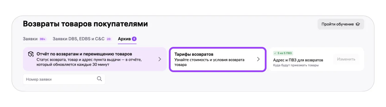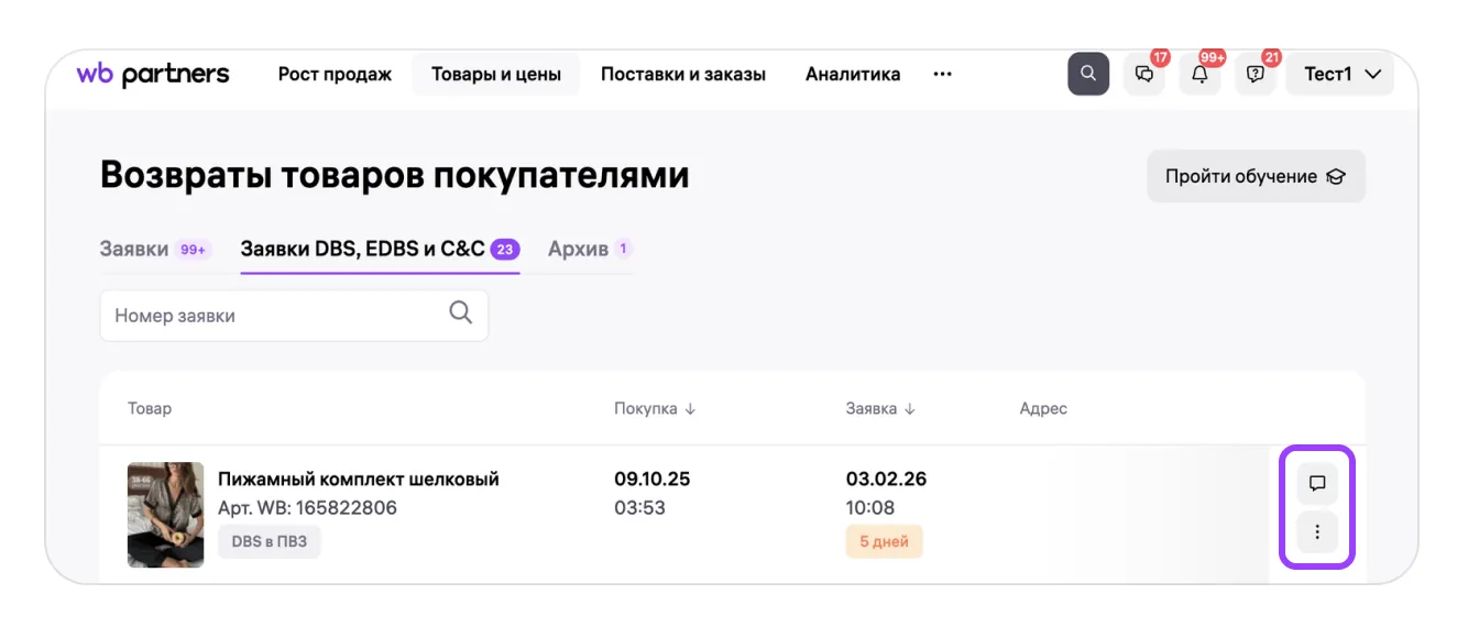 Откройте на портале: Товары и цены → Возвраты покупателей → вкладка «Заявки» или «Заявки только по DBS».