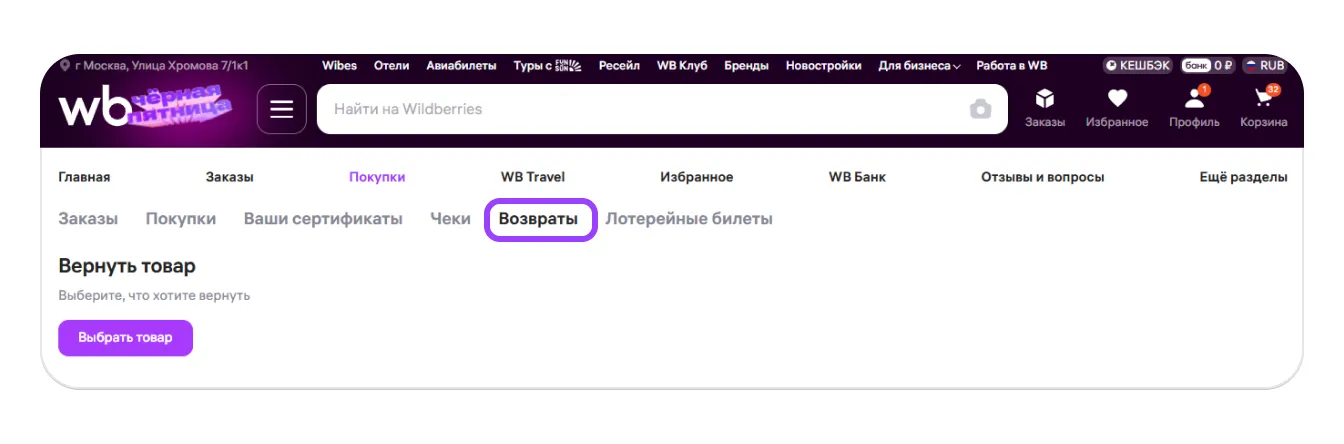Покупатели оформляют заявку в своём профиле на Wildberries.ru: Заказы → Возвраты.