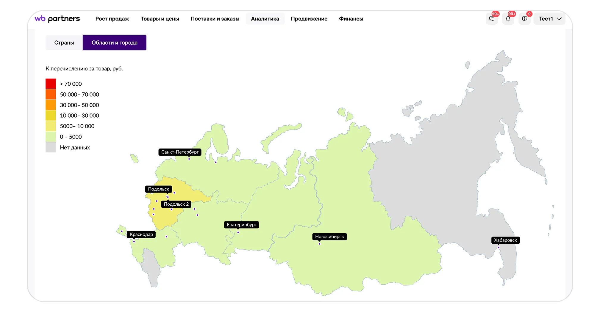 Во вкладке «Области и города» можно посмотреть в каких регионах, в каком количестве реализуются товары. Данные также представлены в двух форматах: в виде карты и таблицы. Чтобы увидеть таблицу, прокрутите страницу ниже.