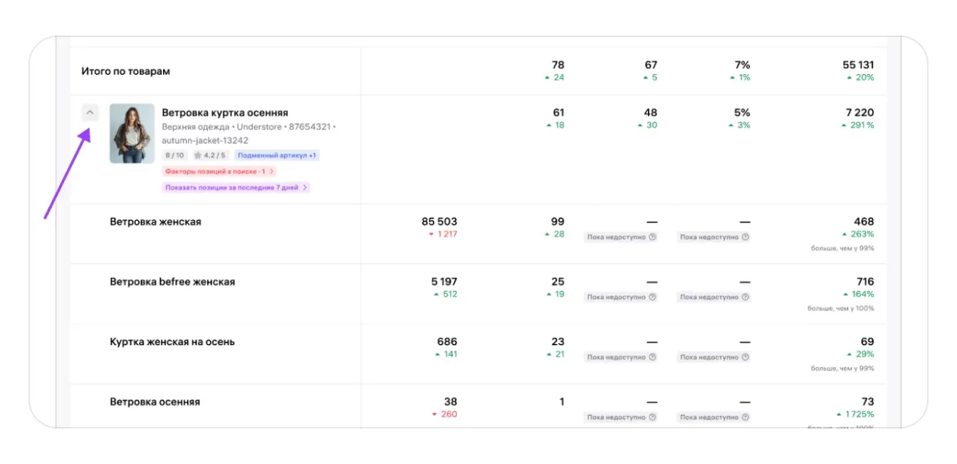 Поисковый запрос и аналитику по нему можно увидеть, нажав на стрелку слева от фото товара.