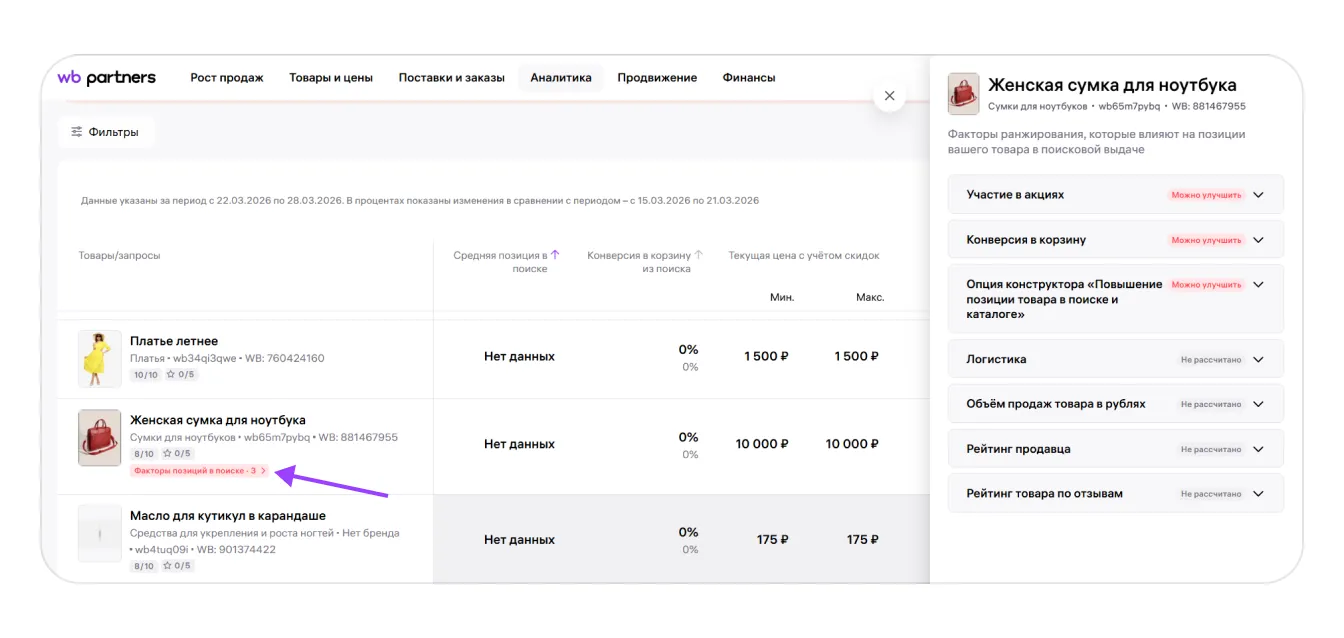 В таблице собраны данные по вашим товарам и их месту в поисковой выдаче в соотношении с товарами других продавцов. Здесь же показаны запросы, по которым покупатели находят ваши товары в поиске, факторы, которые повлияли на позицию ваших карточек, и рекомендации по улучшению позиций.