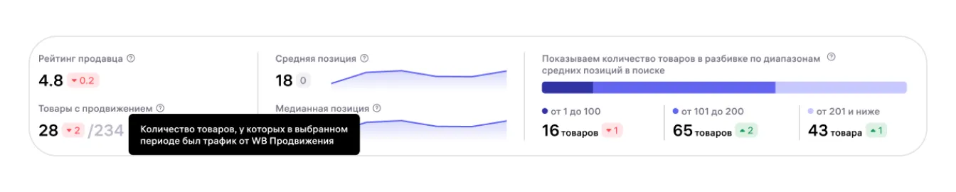 Товары с продвижением — количество товаров, у которых за выбранный период был трафик от WB Продвижения.