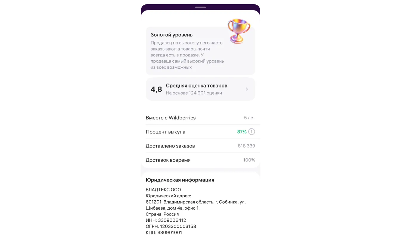 Если вы наведёте курсор на рейтинг продавца в веб-версии, увидите, сколько товаров он уже продал на Wildberries, сколько оценок получил и как давно существует магазин.