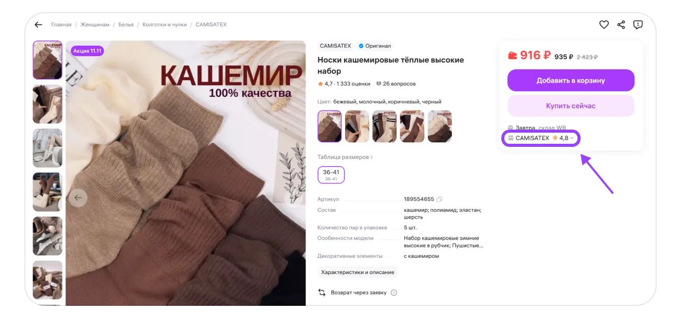 Рейтинг отображается в карточке товара и помогает покупателям оценить надёжность продавца.