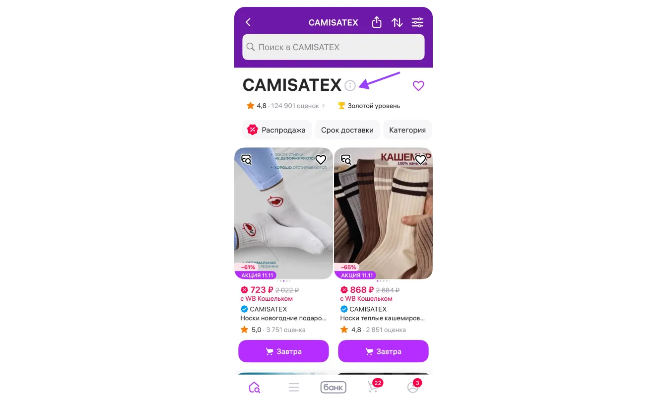 Чтобы увидеть подробную информацию о продавце, нажмите на значок информации «i» рядом с названием магазина.
