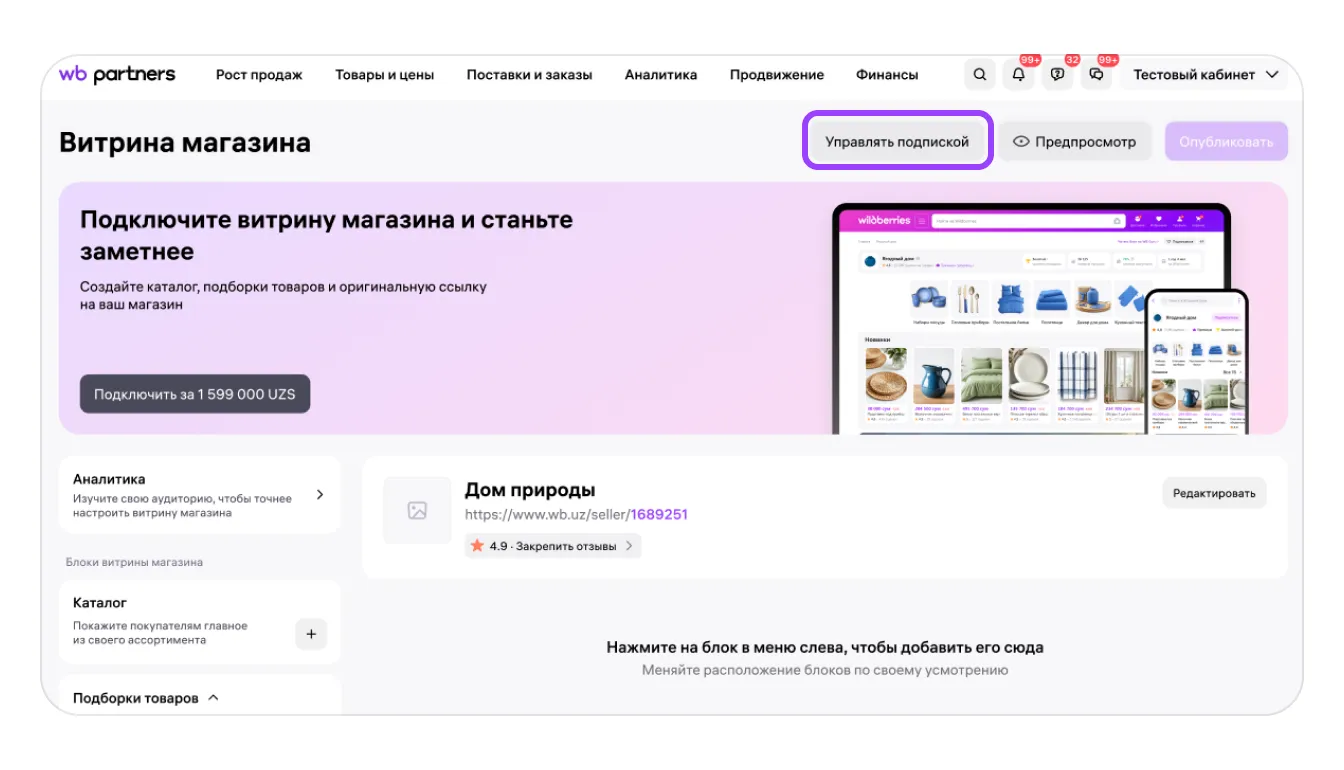 Если вы хотите использовать сервис «Витрина магазина» в полном объёме, нужно купить подписку.