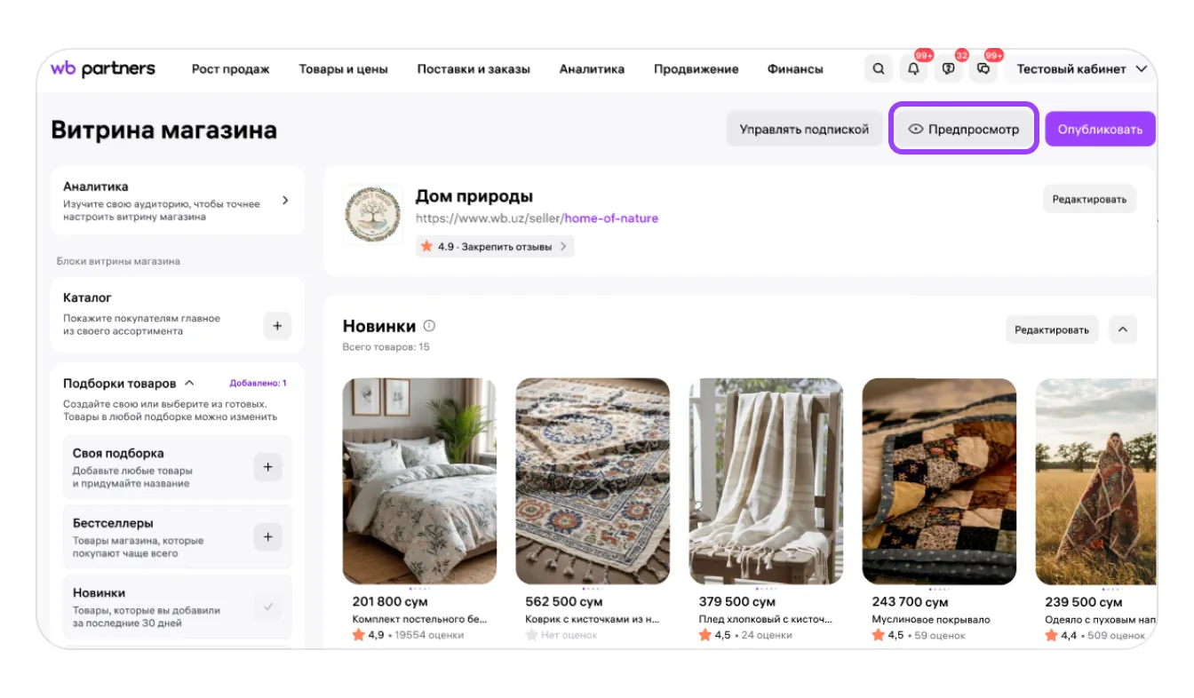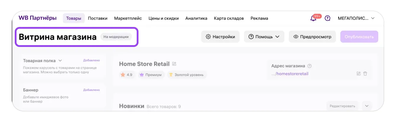 Все изменения, которые вы вносите через «Витрину магазина», можно увидеть глазами покупателя в режиме предпросмотра, до публикации. Предпросмотр покажет страницу вашего магазина как на сайте, так в мобильном приложении Wildberries.