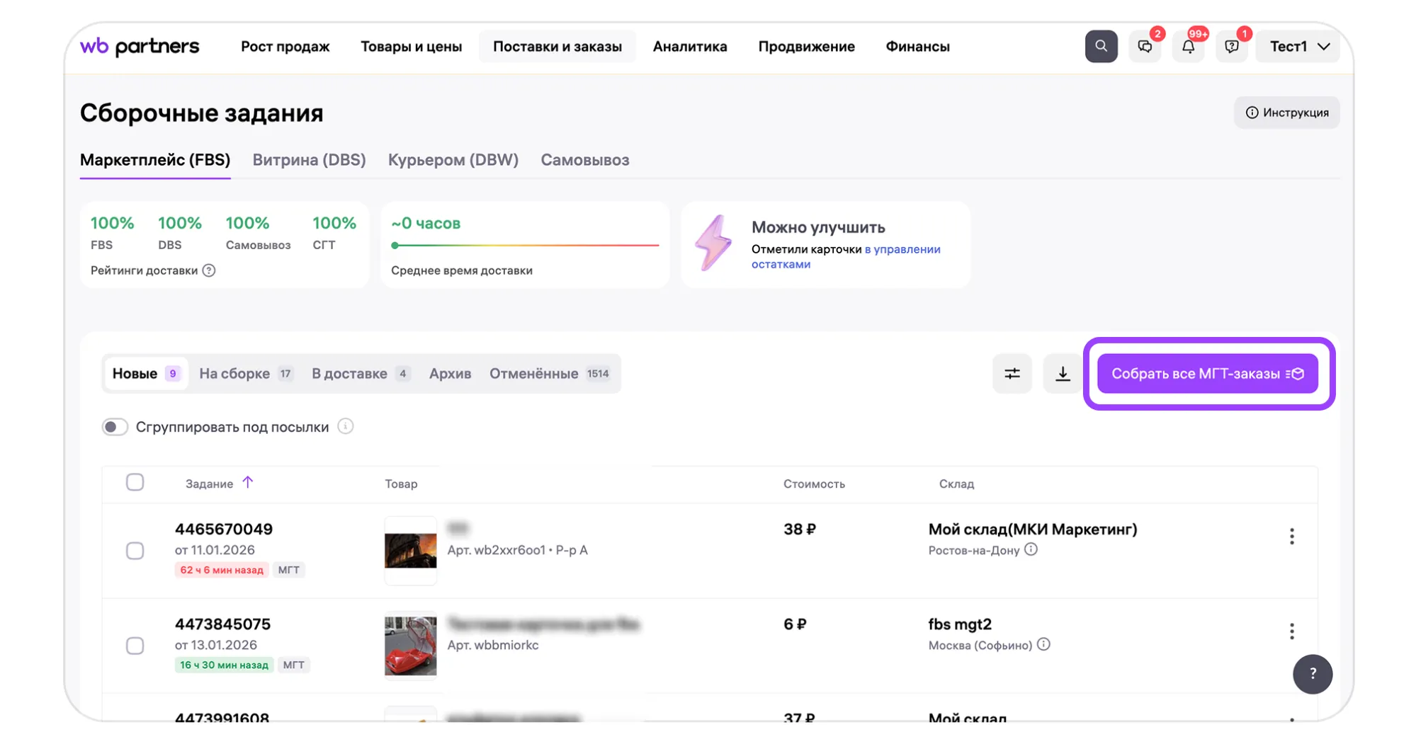 Все новые заказы малогабаритных товаров (МГТ) можно добавить в поставку одним кликом. Для этого нажмите «Собрать все МГТ-заказы»: