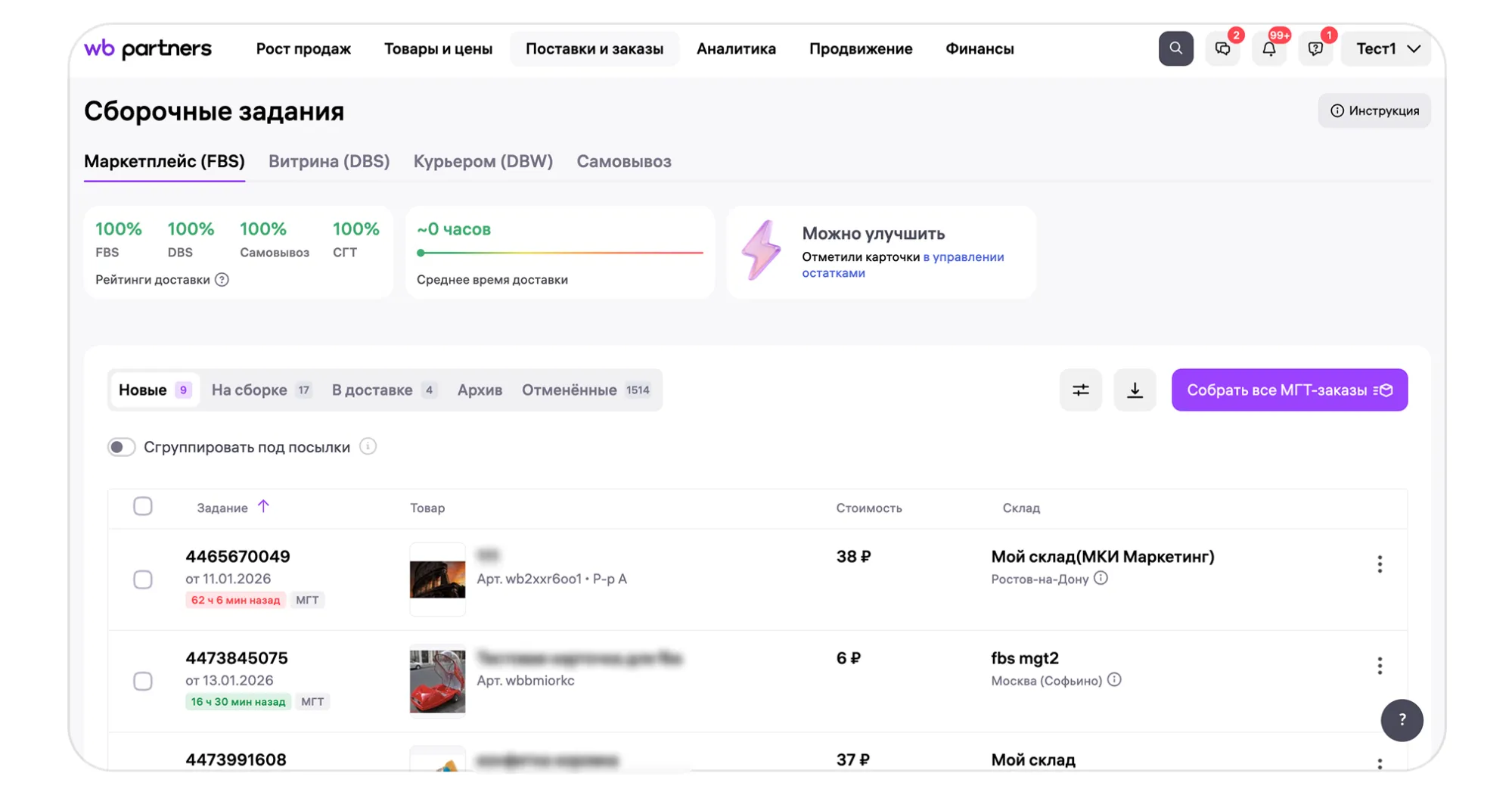 Когда покупатель оформляет заказ на ваш товар, на портале WB Partners автоматически появляется сборочное задание. В нём вы увидите, какой товар нужно упаковать и отгрузить, а также сколько времени прошло с момента поступления заказа.