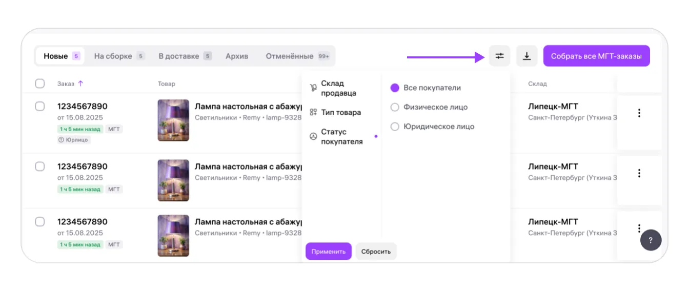 Над сборочными заданиями справа есть фильтры: можно отфильтровать заказы по складу продавца, типу товара (МГТ, КГТ+, СГТ) или статусу покупателя (физлицо / юрлицо). По умолчанию в фильтрах выбраны «все товары», «все склады» и «все типы», но при необходимости можно работать с только с выбранной в фильтре группой заказов.