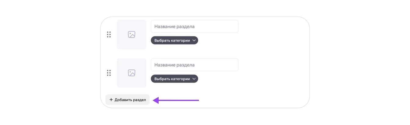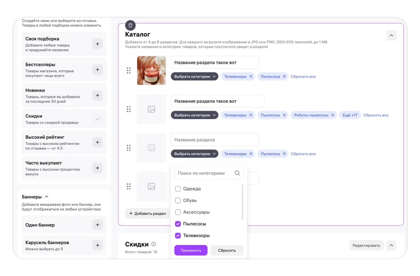 Для каждого раздела загрузите изображение, введите название и выберите категории товаров.