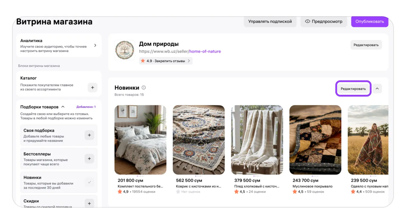 5. Когда всё готово, нажмите «Опубликовать», чтобы подборка появилась на странице вашего магазина.
