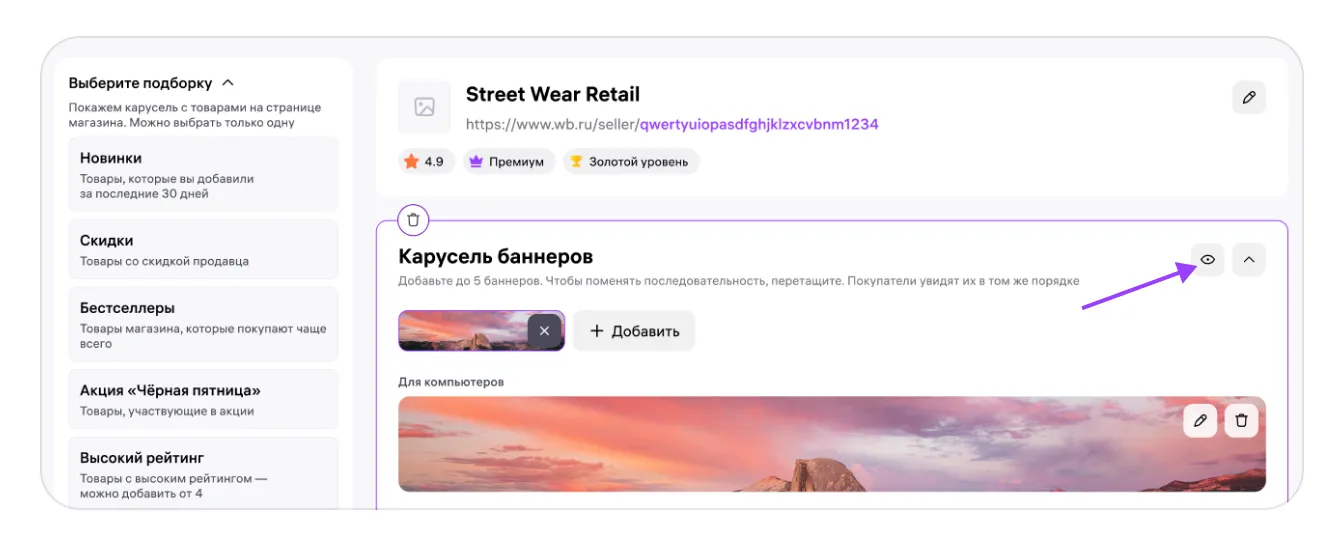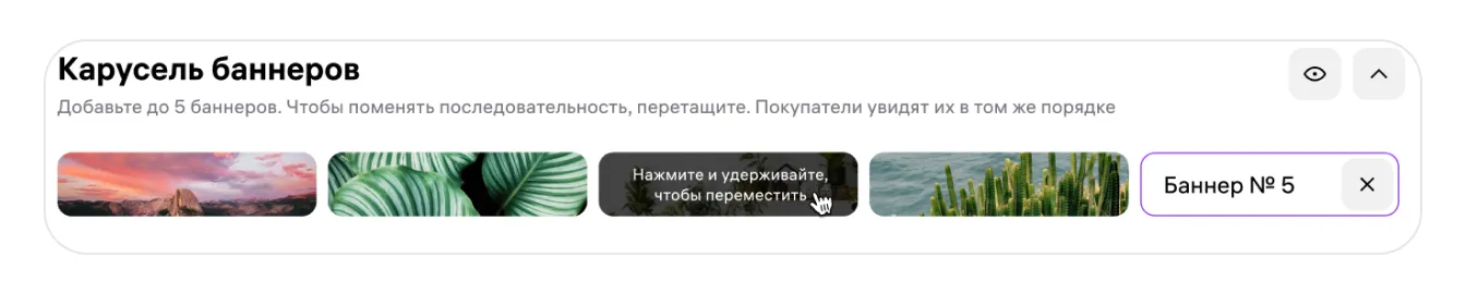 2. Загрузите подготовленные изображения для десктопа, мобильных устройств или те и другие. После загрузки изображений станет доступен предпросмотр карусели баннеров: для этого нажмите на значок 👁.
