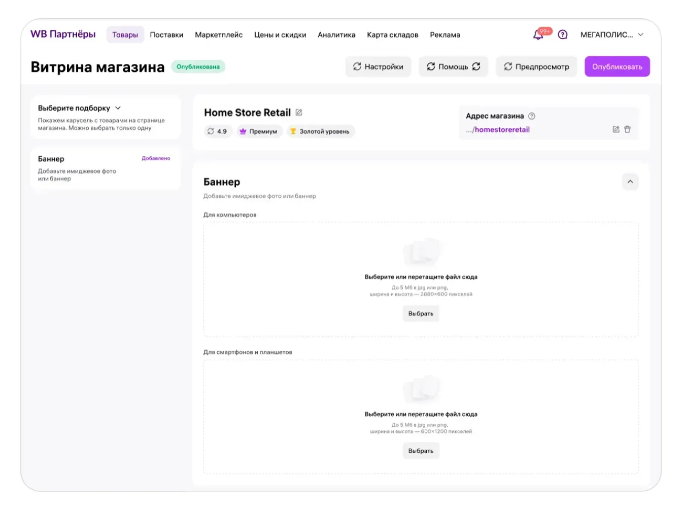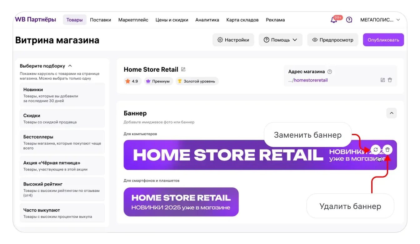 5. Чтобы посмотреть, как баннеры будут смотреться на странице вашего магазина, нажмите «Предпросмотр» в правом верхнем углу. Если всё хорошо, нажмите «Опубликовать».