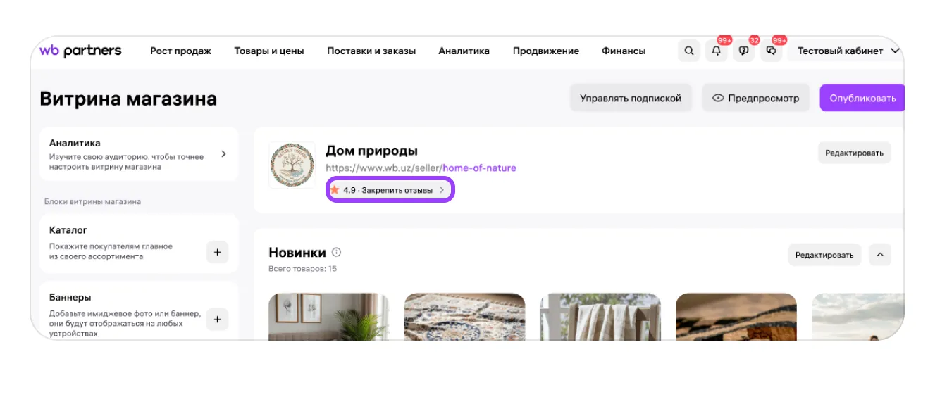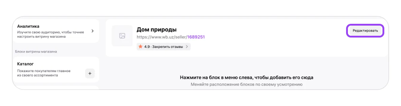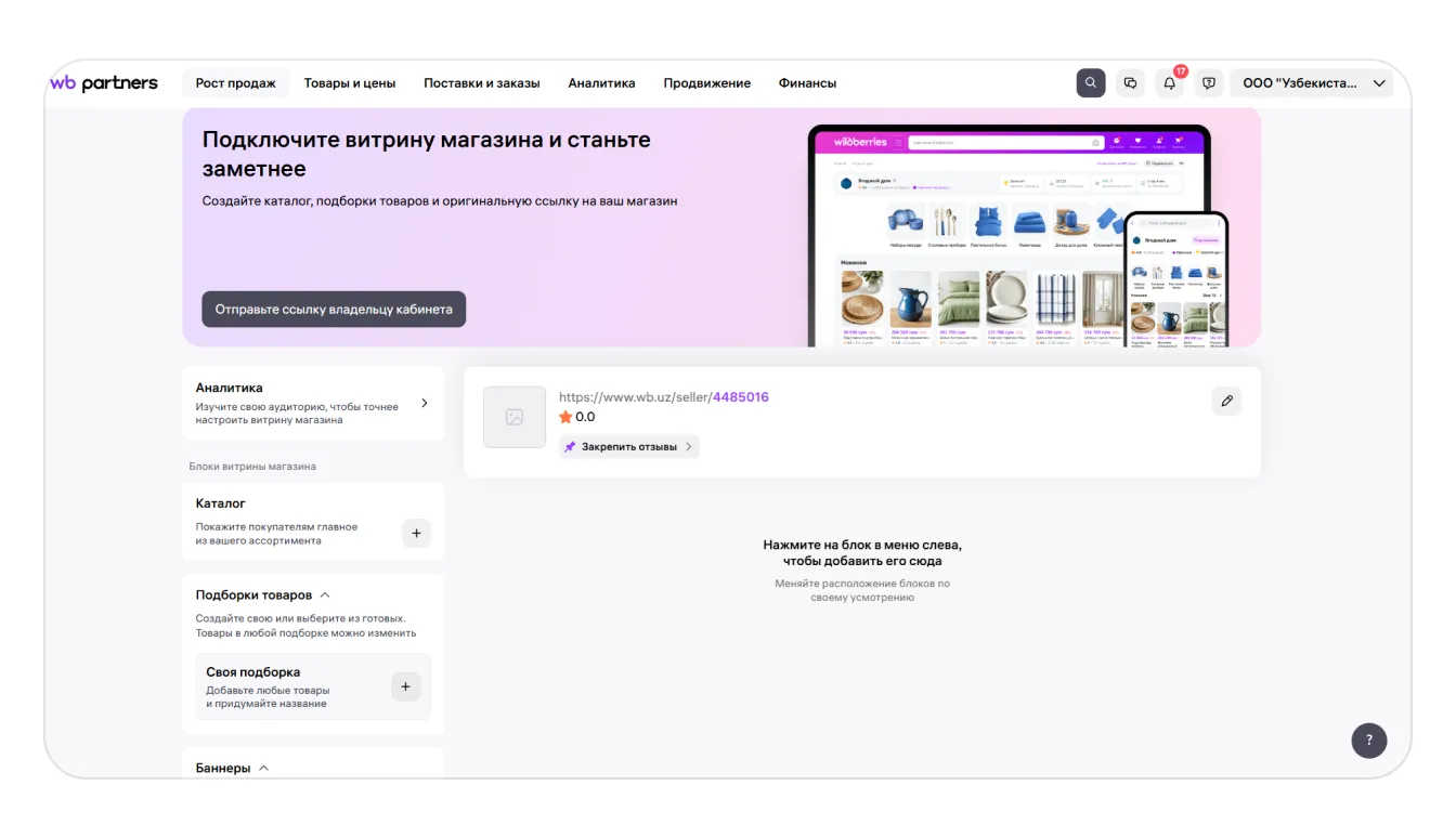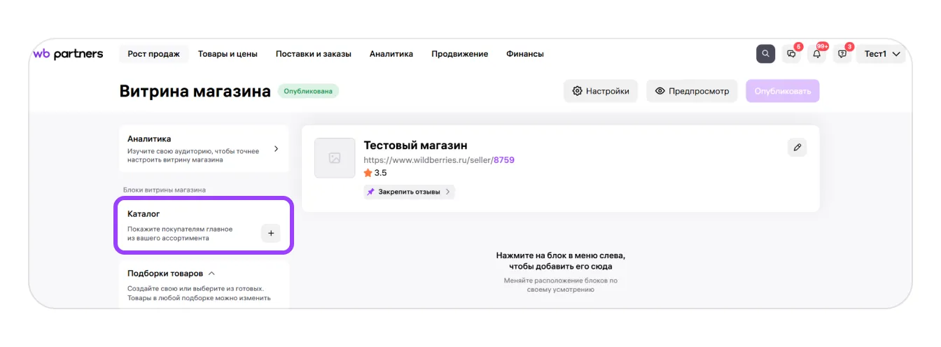 Чтобы открыть меню Витрины и начать редактирование, перейдите в главном меню портала Рост продаж → Витрина магазина. На странице вы увидите все блоки и возможности Витрины.