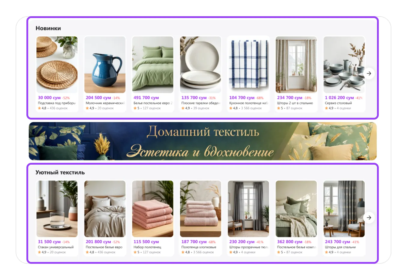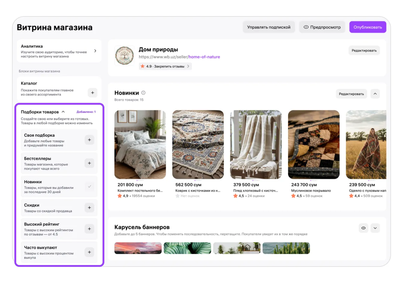 Подборки — это тематические группы товаров, собранные в отдельные блоки-карусели на странице вашего магазина. Они помогают выделить важные для вас позиции: новинки, товары со скидкой, бестселлеры или любые другие категории.