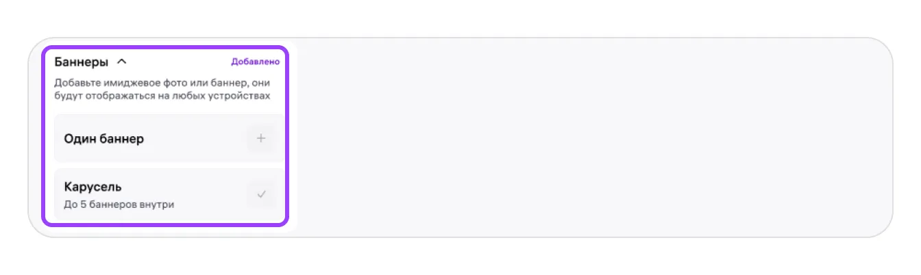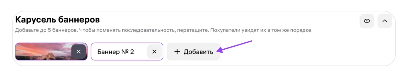 4. Чтобы добавить ещё баннеры в карусель, нажмите кнопку «Добавить», которая появится рядом с уже загруженным вами баннером, и повторите все перечисленные выше действия. Всего вы можете добавить 5 баннеров.