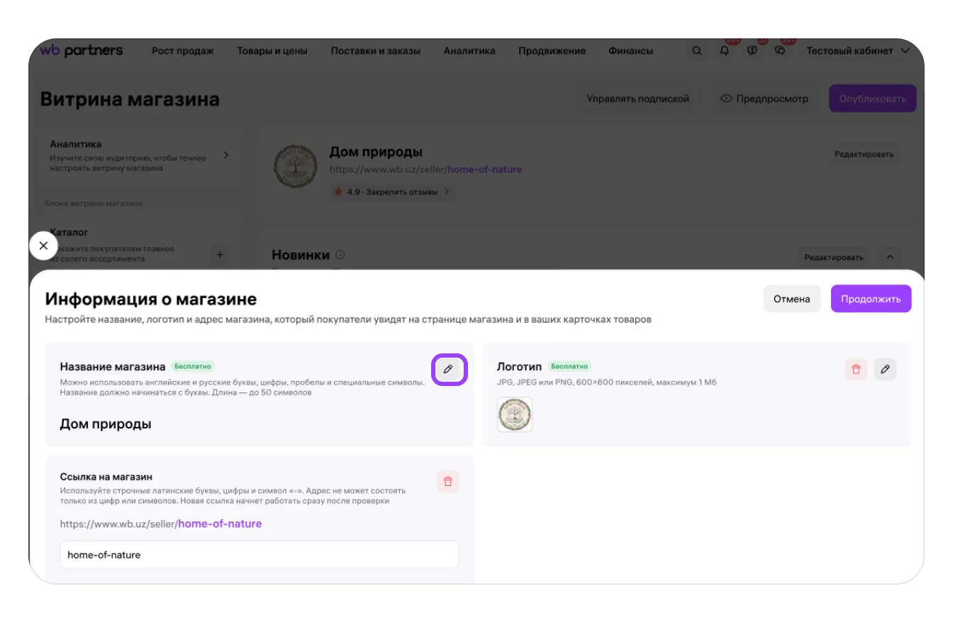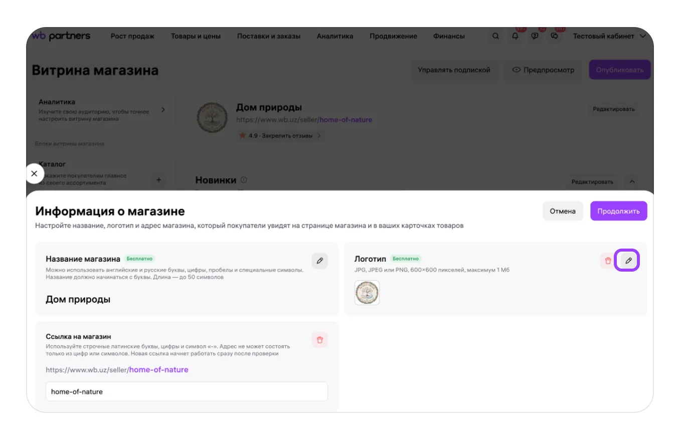 Вы можете загрузить, изменить или удалить логотип своего магазина через «Витрину магазина». Это бесплатно для всех продавцов, подписку подключать не требуется.