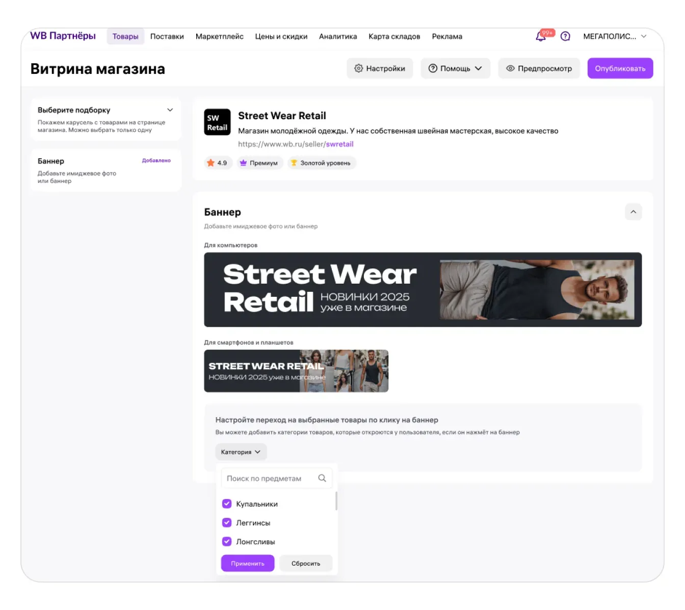 4. Чтобы сделать баннер кликабельным, нажмите «Указать категории». В выпадающем окне отметьте одну или несколько категорий товаров из вашего ассортимента. Например, если вы продаёте обувь, можно выбрать «Босоножки», «Сапоги» или «Кроссовки». Нажмите «Применить».