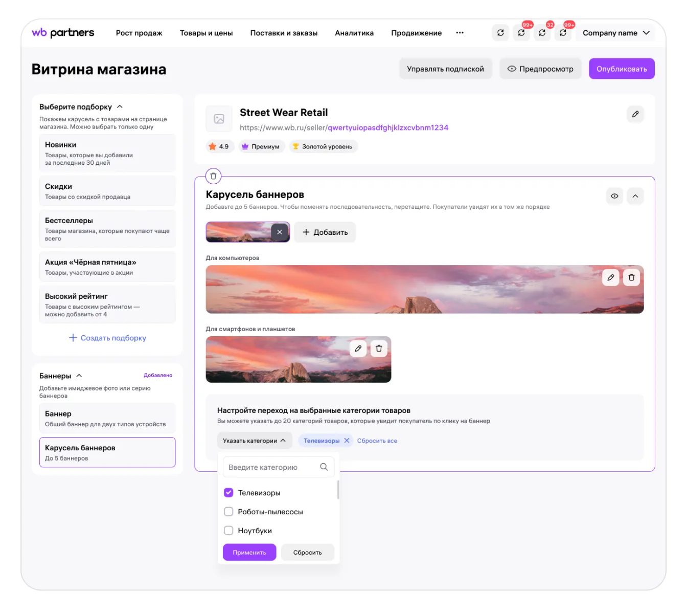 3. Чтобы сделать загруженный баннер кликабельным, нажмите «Указать категории». В выпадающем окне отметьте одну или несколько категорий товаров из вашего ассортимента. Сохраните изменения.