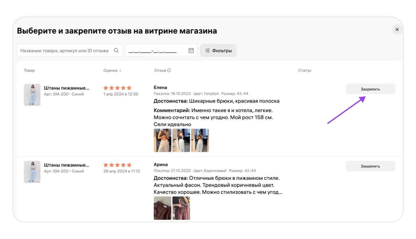 3. Появится окно со списком отзывов, которые можно закрепить на витрине. Выберите в общем списке нужный и нажмите «Закрепить».