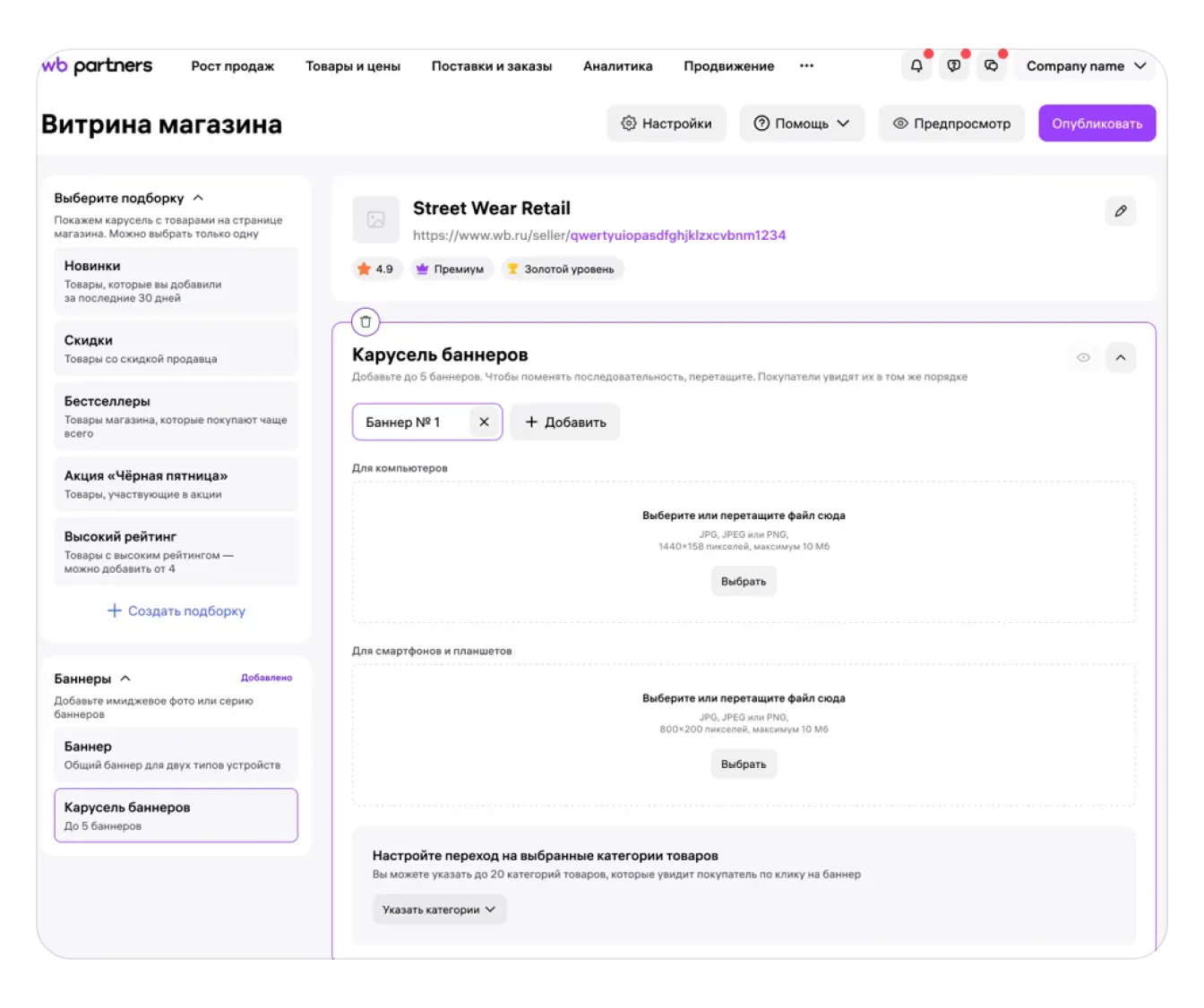 Вы можете загрузить один или несколько баннеров — до 5 штук. Если загружено несколько, на странице магазина покупатели увидят карусель баннеров: изображения будут сменять друг друга автоматически или по клику на стрелки. Изображения для мобильной и десктопной версий одного баннера могут быть одинаковыми или разными.