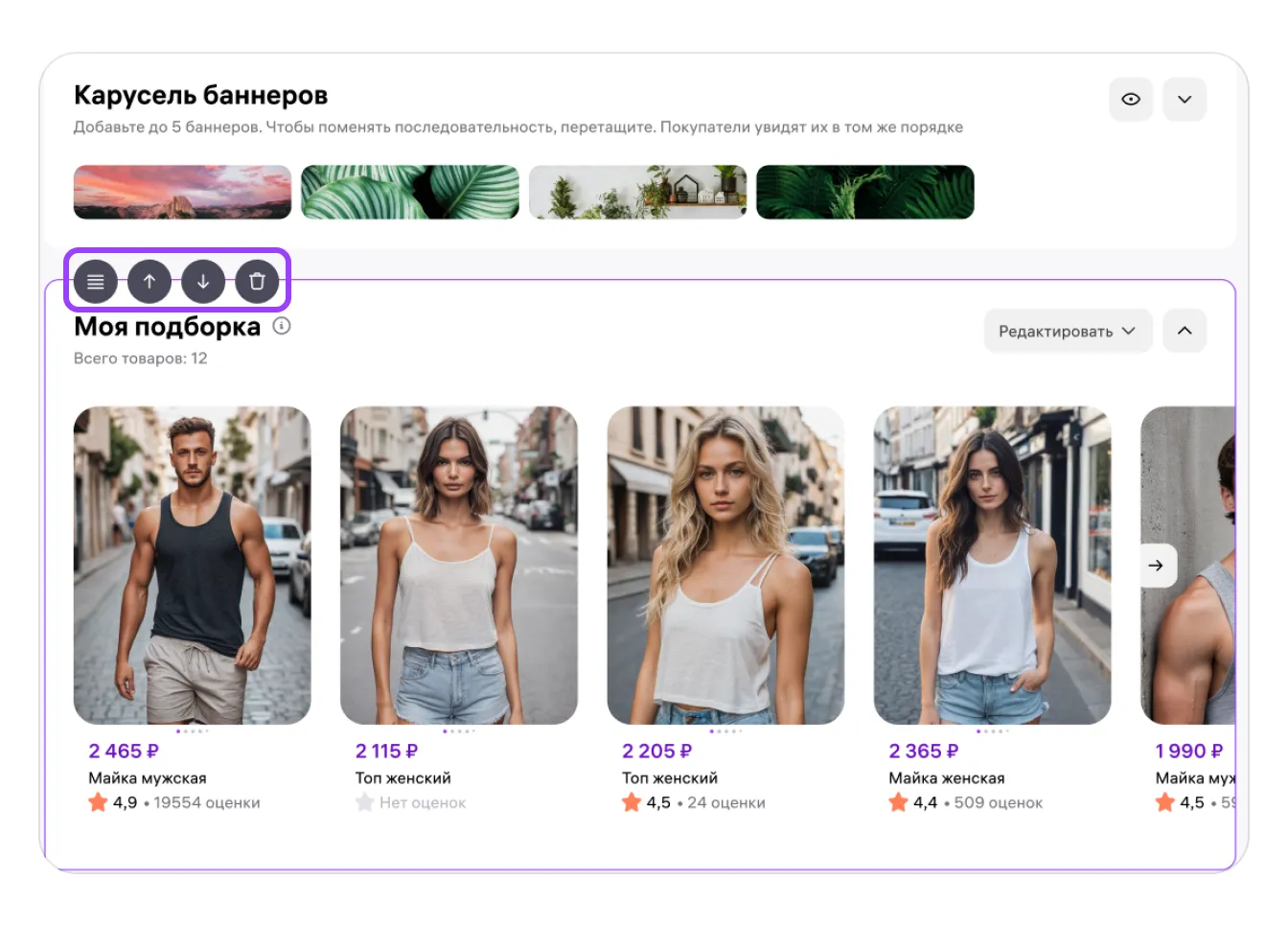 Чтобы переместить подборку, выделите её в общем списке баннеров и подборок. В левом верхнем углу появится меню: выберите нужную кнопку, чтобы переместить или удалить подборку.