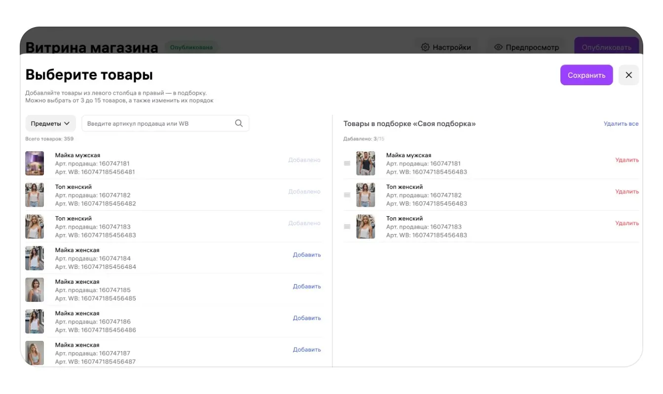 3. В колонке слева собраны все ваши карточки товаров, в колонке справа — товары в подборке. Нажимайте «Добавить» или «Удалить», чтобы настроить список. Учитывайте максимальный объём подборки в 15 карточек: чтобы добавить в подборку новые карточки, сначала удалите из колонки справа такое же их количество.