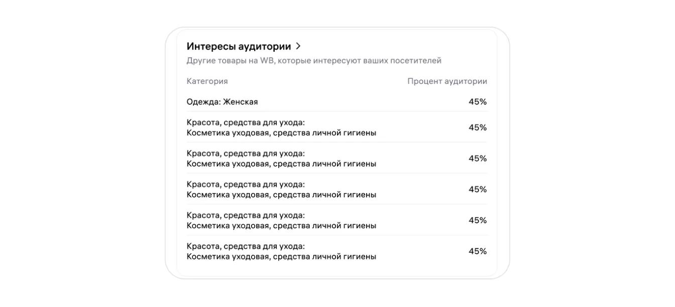 Интересы аудитории. Показываем, какими ещё товарами на маркетплейсе интересуется аудитория, которая чаще всего заходит на вашу страницу.