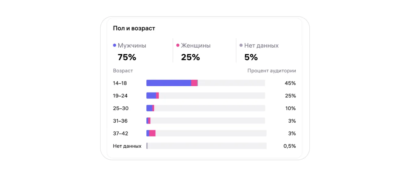 Многие покупатели не указывают свои данные, поэтому мы составляем их портрет по поведению на Wildberries и покупкам в целом. На виджетах возможна формулировка «Нет данных»: это значит, мы не смогли узнать пол и возраст части покупателей, но всё равно учли их в общей статистике