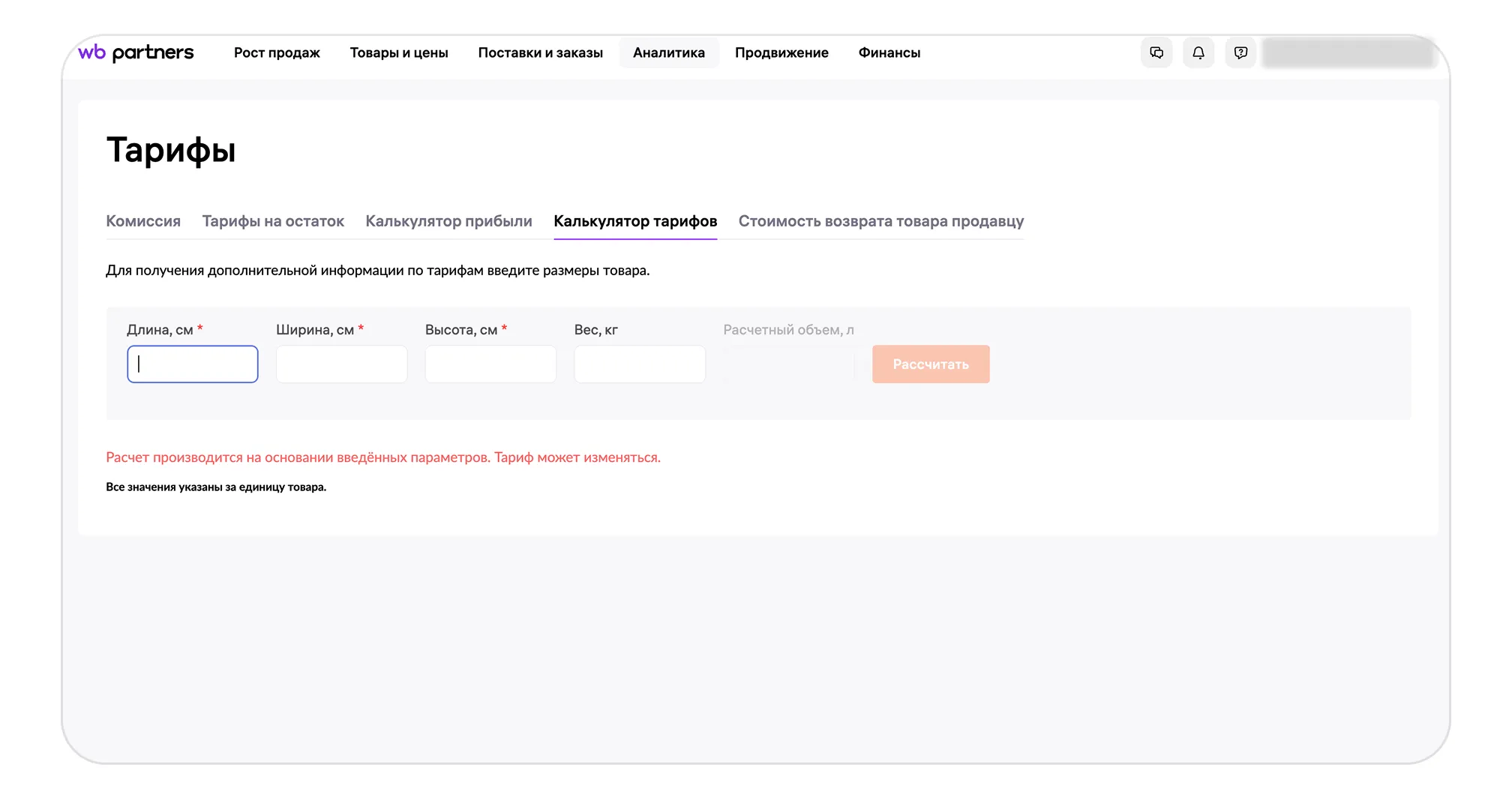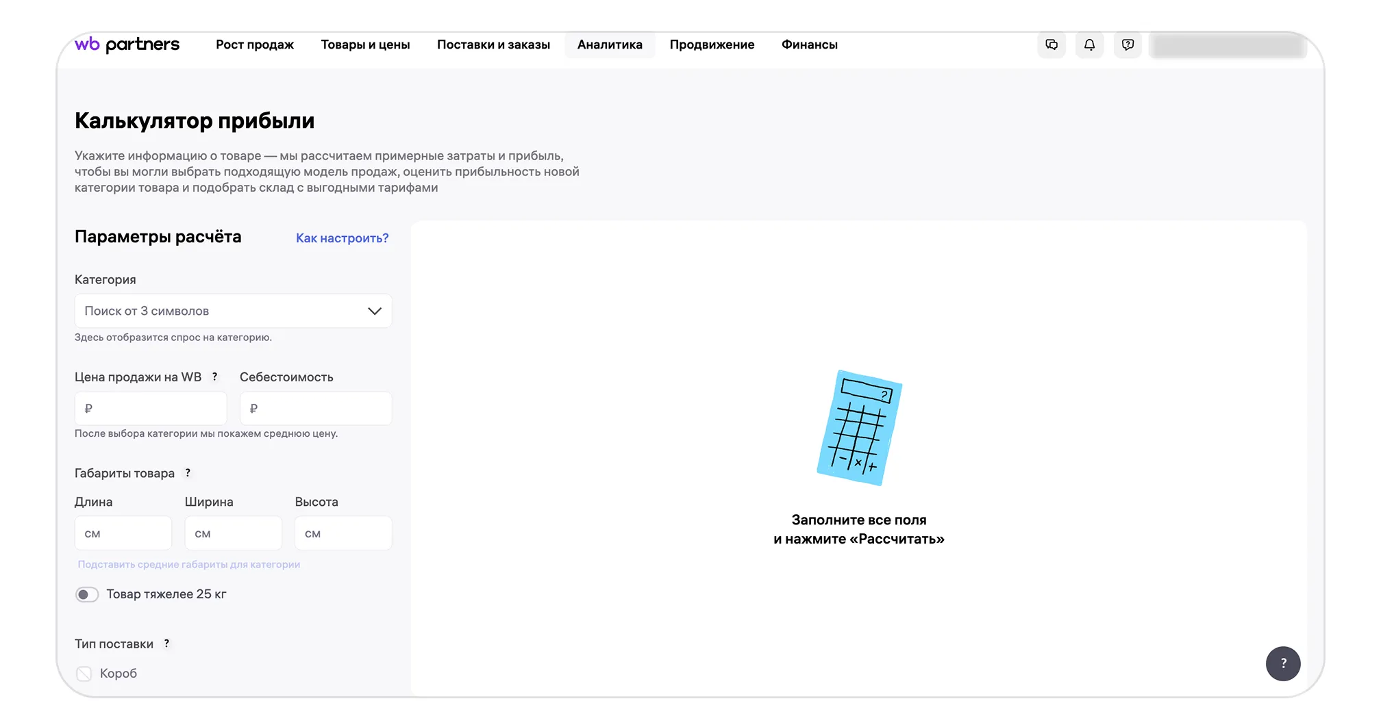 Это первая версия инструмента — с ограниченным набором функций. Он позволяет рассчитать стоимость логистики, хранения и приёмки вашего товара по его габаритам и весу в индивидуальной упаковке: