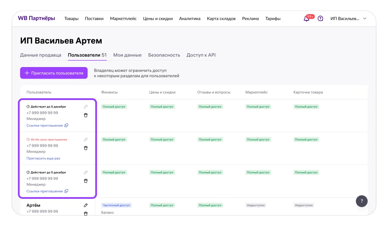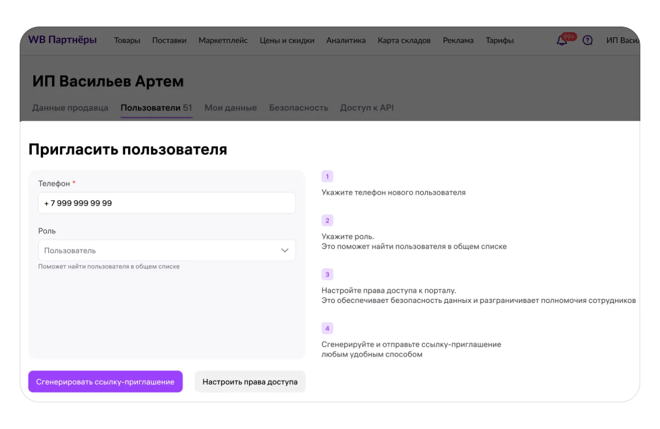 Обратите внимание, можно только передать права владельца личного кабинета другому пользователю. Передать свой магазин на WB другому юрлицу нельзя, поскольку он закрепляется за определённым ИНН