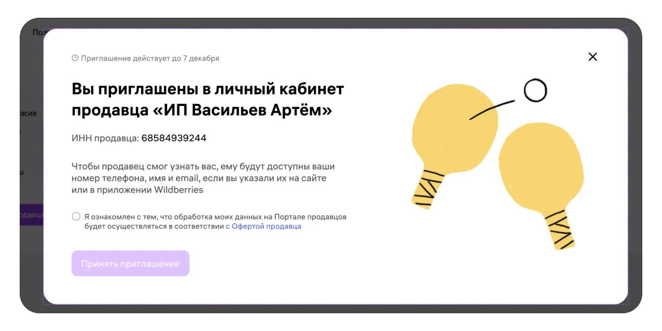 Открыв ссылку-приглашение, пользователь попадает на сайт seller.wildberries.ru, входит в свой профиль и видит предложение присоединиться к вашему личному кабинету.