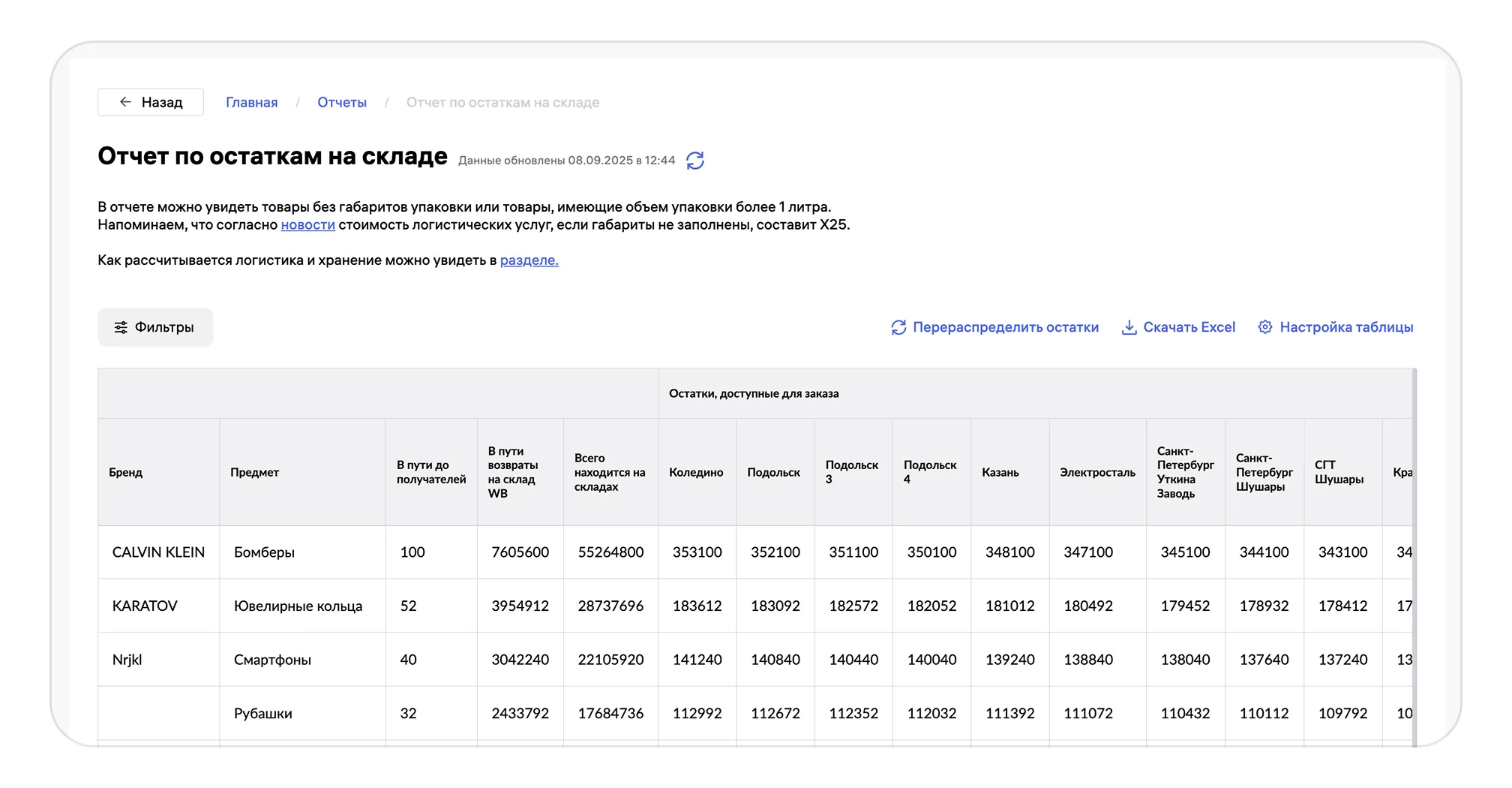 Из этого отчёта вы можете узнать количество вашего товара на складах, а также в пути до получателя и от него в случае возврата.