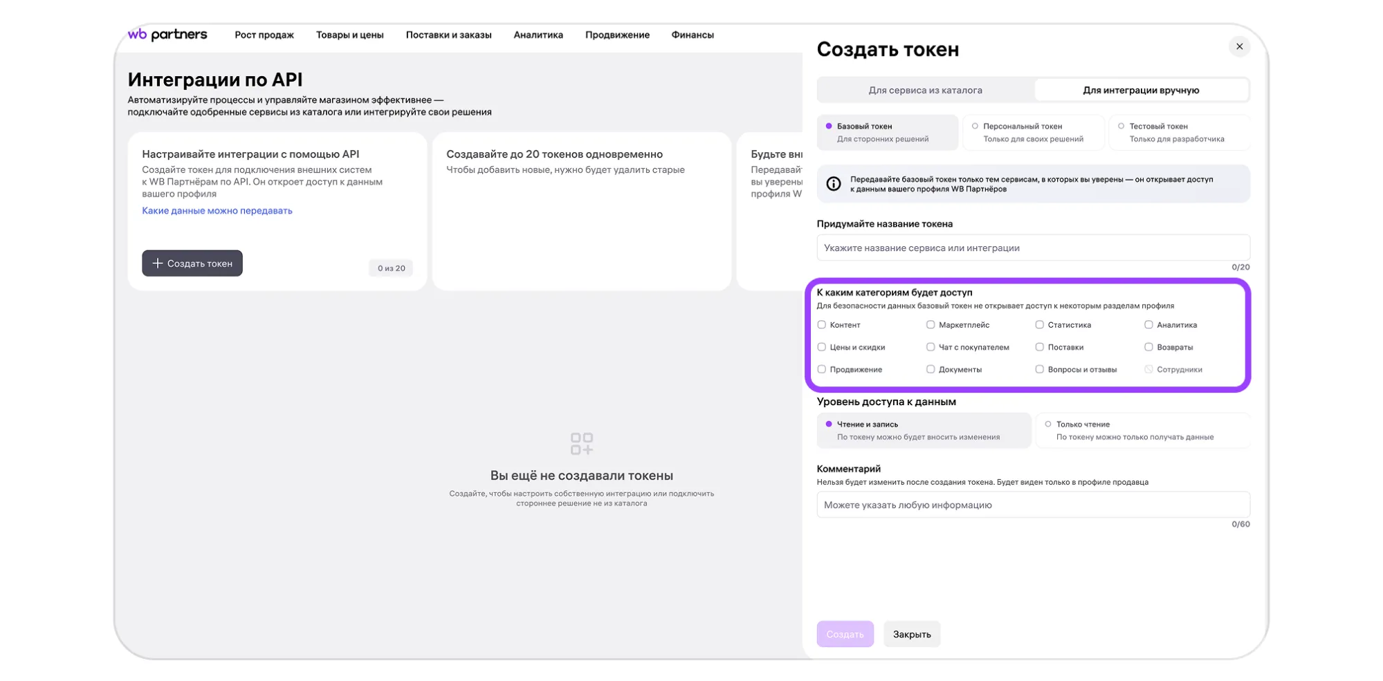 Если владелец профиля на портале WB Partners изменится, токены могут перестать корректно работать. Новому владельцу нужно создать токены заново. Рекомендуем фиксировать, какие токены вы создавали и для каких интеграций, чтобы при необходимости быстро их восстановить.