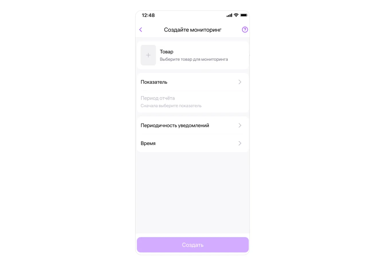 2. Выберите товар, нужный показатель и укажите дни и часы для отчётов. Когда всё заполнено, нажмите «Создать».