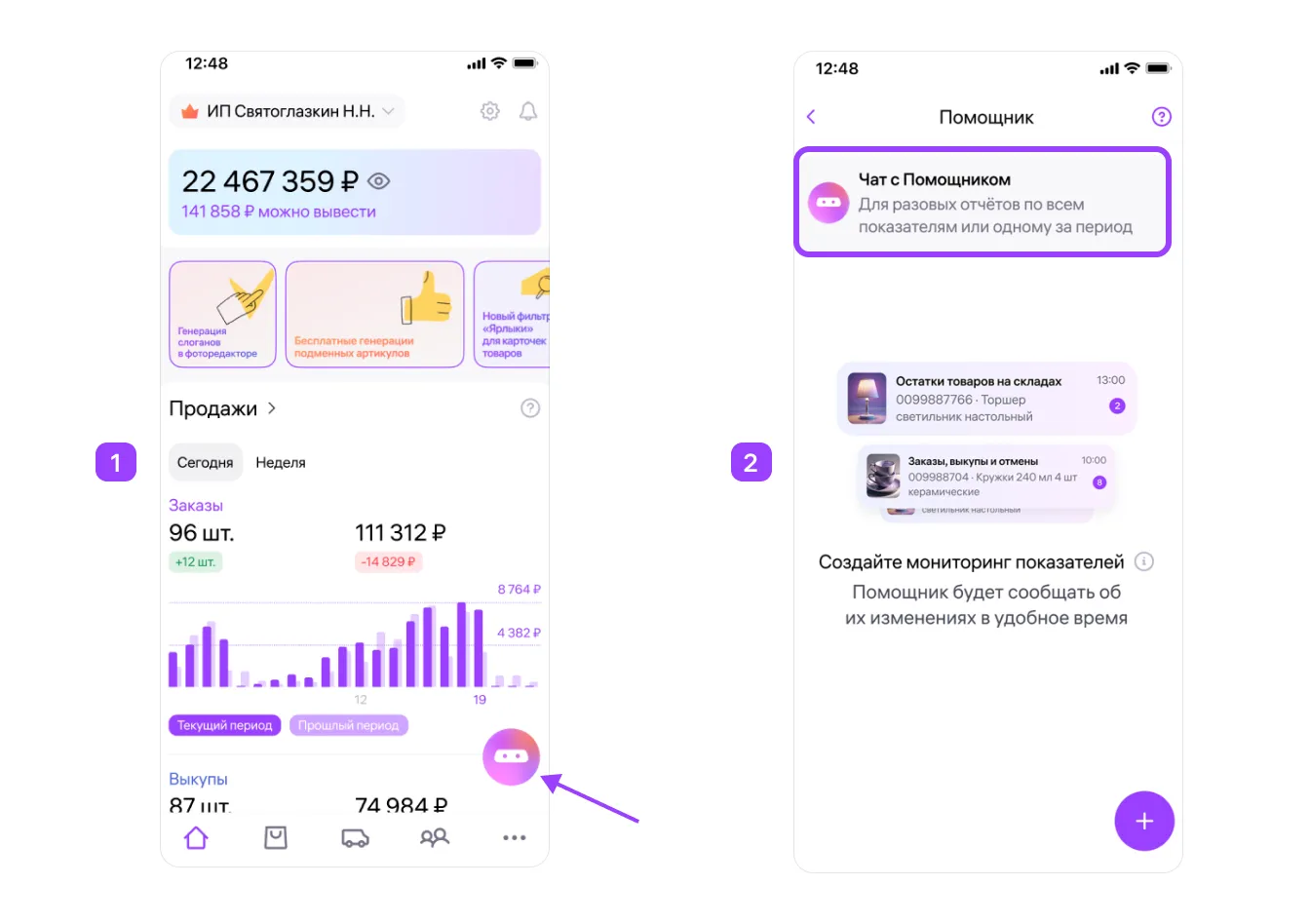 Иногда показатели в «Помощнике» могут немного отличаться от других аналитических отчётов. Это связано с тем, что в разных отчётах используются разные алгоритмы расчёта или периоды. В «Помощнике» данные всегда привязаны к конкретному артикулу и актуальны на дату, указанную в отчёте